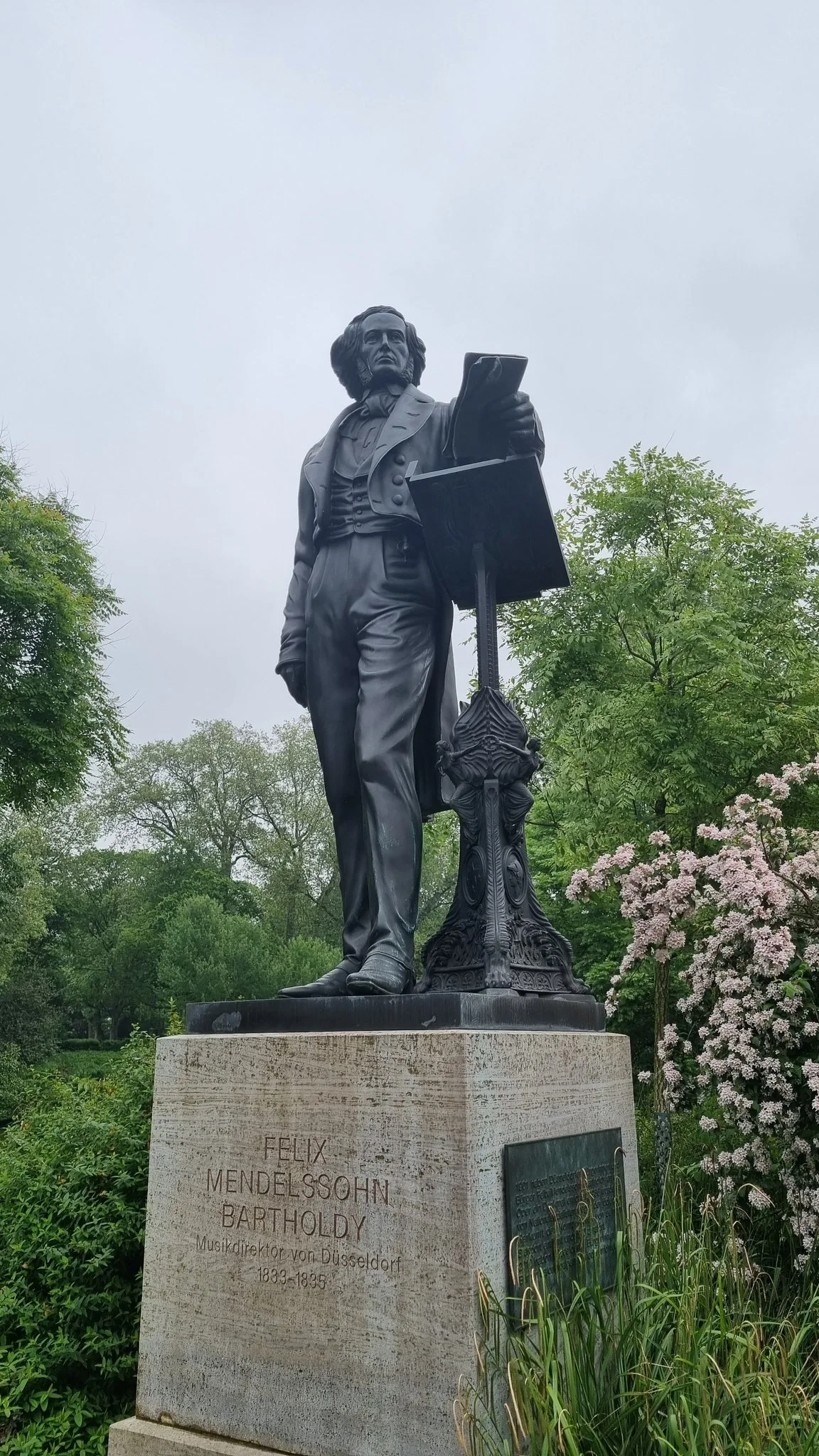 물론 내가 시립공원에 새만 보겠다고 간 것은 아니었다. 시립공원 바로 옆에는 뒤셀도르프 오페라 하우스 (Deutsche Oper am Rhein)가 있는데, 그 옆에는 뒤셀도르프와 관련된 인물의 동상이 하나 있다. 그 인물은 무려, 내가 가장 사랑하는 작곡가 펠릭스 멘델스존이다. 멘델스존 이야기는 이 시리즈의 마지막 편에서 한참 하겠지만 여기서 살짝 맛보기로 알려드리자면, 멘델스존은 어릴 적 쓴 징슈필* 카마초의 결혼이 미지근한 반응에 그치자 마음에 상처를 받았는지 이후 평생 오페라를 단 한 개도 완성하지 못했다. 그래서였을까, 25세의 나이로 얻은 첫 직장 뒤셀도르프 오페라 극장 감독으로 취임한 뒤 매일같이 오케스트라 연주자들의 해이한 기강에 개탄하며 라이프치히에서 이직 제안이 오자마자 옳다구나 좋아라 하고 라이프치히로 탈주했다. 다시 말해 멘델스존은... 뒤셀도르프를 싫어했다. 정말 싫어했다.