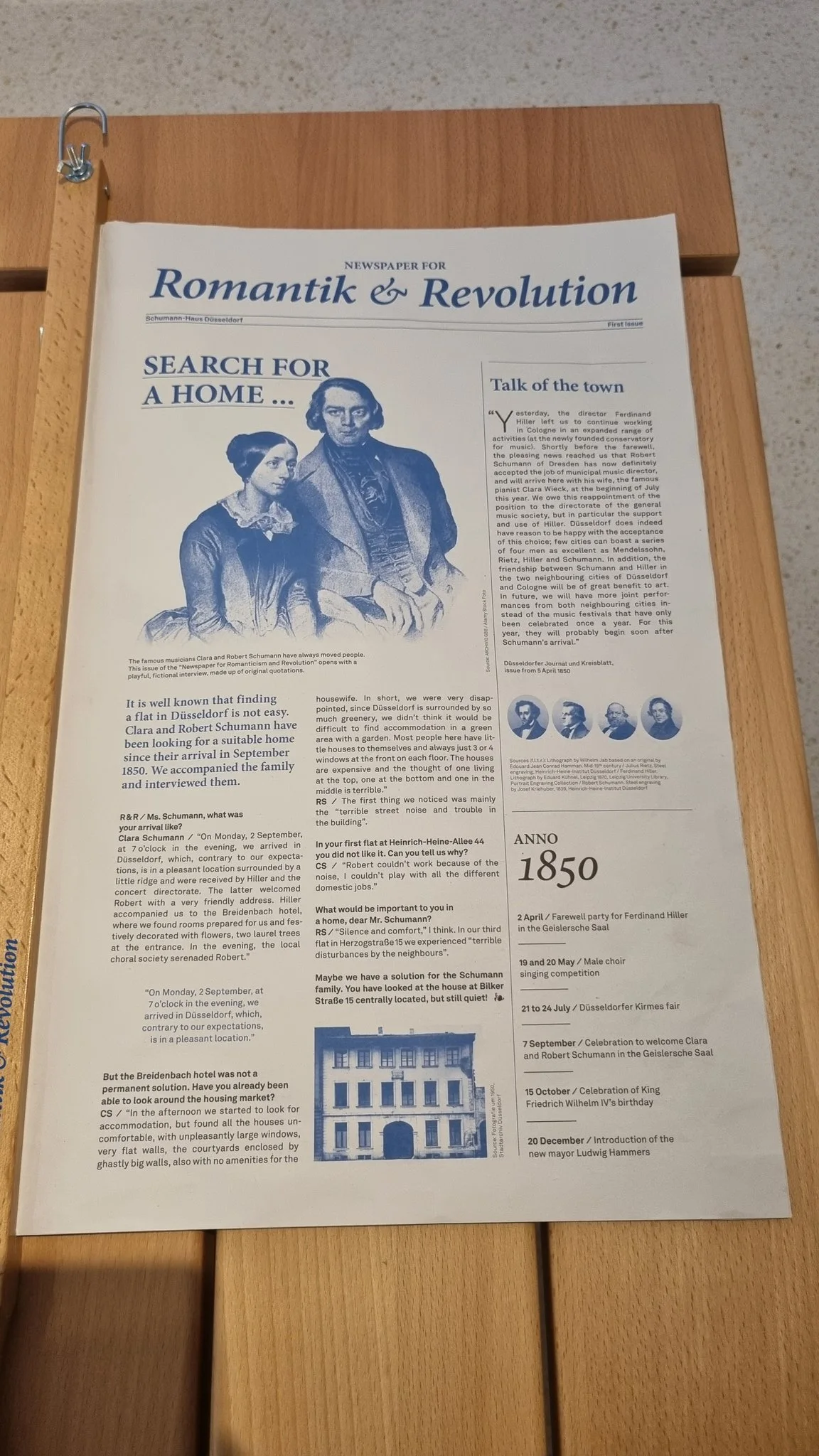 박물관은 슈만과 클라라가 이사 온 뒤셀도르프의 이야기로 시작한다. 벽에는 슈만 부부의 연대기, 세계사, 그리고 음악사 연대기가 적힌 연표가 동시에 펼쳐진다. 뒤셀도르프에 처음 도착한 슈만 부부의 눈에 이곳의 의료, 교육은 어땠는지, 당시 시대상이나 법률은 어땠는지를 설명해 주며 한쪽에는 슈만 부부 일보가 놓여 있다. 한 면에는 뒤셀도르프에 오고서 몇 개월간 있던 슈만과 클라라 부부 관련 콘서트 기사를 써 놓았고 다른 곳에는 슈만 부부가 뒤셀도르프에서 좋아하던 레시피도 적혀 있다. 영어하고 독일어가 잘 지원되고 있어서 꼼꼼히 읽었다. 이 관에서는 소장품이 꽤 많은지, 내가 갔을 때는 클라라의 스타킹과 손수건이 전시되어 있던 것 같은데 주기적으로 소장품 로테이션을 돌린다고 한다. 하얀 스타킹에 C.S (클라라 슈만)이라 수 놓여 있는 게 참 귀여웠다. 체육복 잃어버리지 말라고 교복 살 때 교복점에서 이름 박아달라고 하는 것도 연상되고 그랬다. 이어 1관이 슈만의 뒤셀도르프였다면 2관은 뒤셀도르프의 슈만이다. 이 방에는 슈만의 '교향곡 '라인'악보도 있고, 슈만이 뒤셀도르프에서 어떤 직책을 맡아 어떻게 잘 헤쳐... 나가려고 했는지를 이야기하고 있다. 또 슈만 이전과 이후 뒤셀도르프를 거쳐간 주요 음악가들에 대해 적어놓은 책도 있었는데, 사실 슈만보다 먼저 뒤셀도르프를 거쳐간 작곡가 가운데 멘델스존이 적혀 있길래 펼쳐 봤던 책이었다.