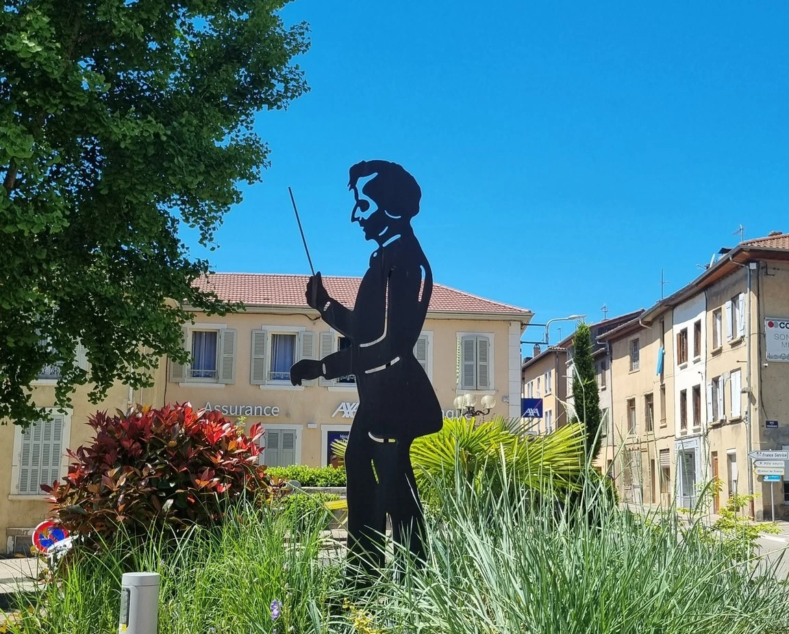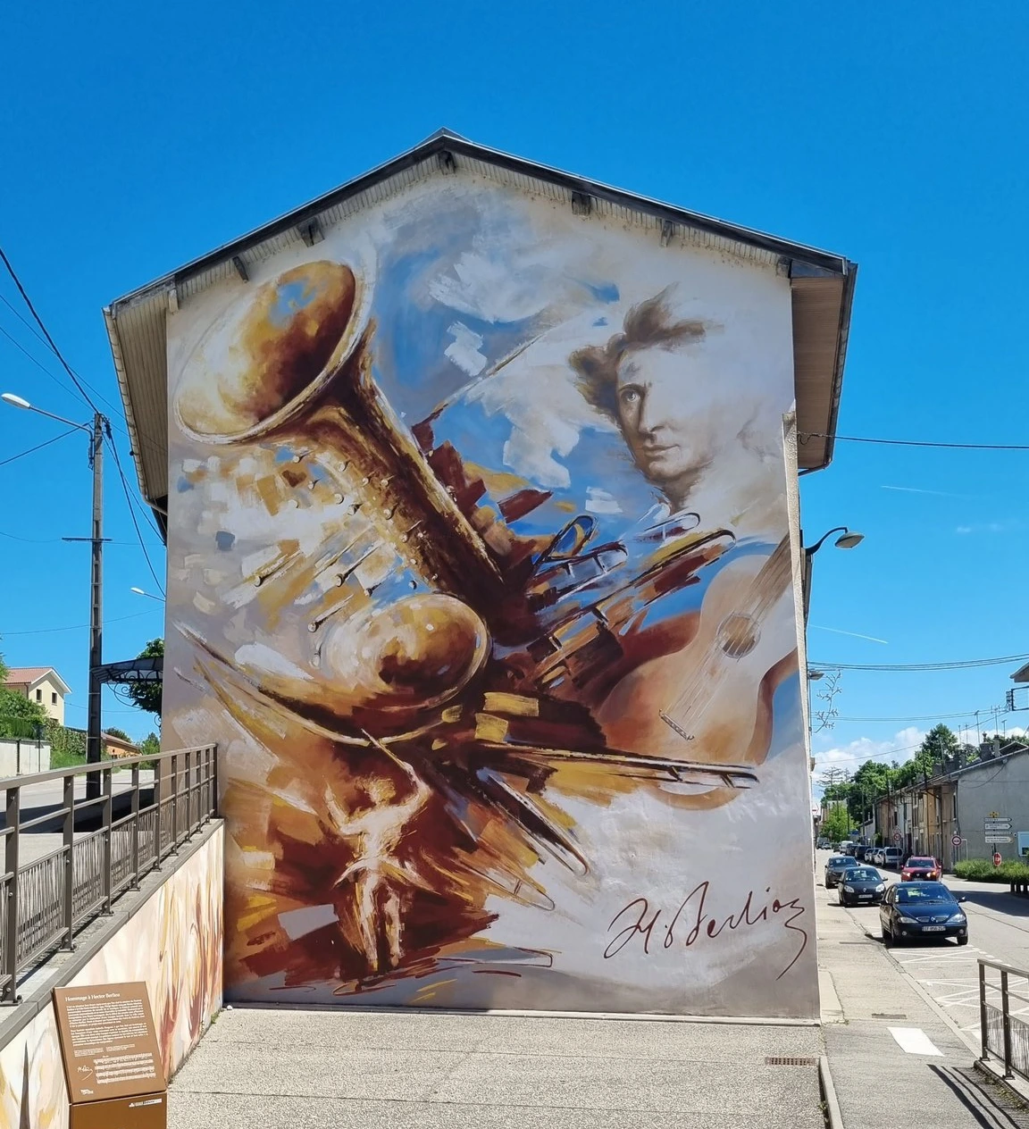 코트 생탕드레에 내리면 베를리오즈 사망 100주기 동상이 우리를 맞이한다. 베를리오즈의 사진 모습을 그대로 재현해 놓아 '와, 내가 정말 베를리오즈의 도시 (x) 마을 (o)에 왔구나!' 하는 생각이 들게 만든다. 이 동상이 있는 엑토르 베를리오즈 광장에서 도로를 따라 10분 정도 걸어가면 베를리오즈 벽화가 그려진 건물이 나온다. 파란 하늘과 하얀 구름 사이로 몰아치는 금빛 악기들... 특히 베를리오즈가 좋아하던 관악기와 피아노를 못 치는 베를리오즈가 대체품으로 쓰기도 했고 젊은 시절 이탈리아 산을 찾아다닐 때 메고 다니기도 했던 통기타가 그려져 있다. 왼쪽 아래로는 지휘하는 베를리오즈의 모습이 거친 하얀 붓질로 그려져 있는데, 왼쪽에 설명을 보면 '베를리오즈의 땅(Terres de Berlioz)' 같은 문구와 함께 베를리오즈의 음악 몇 마디가 적혀 있으나 이때는 이미 기온이 25도 가까이를 돌파했던지라 너무 덥고 지쳐 아무 생각도 안 들었던 것 같다.