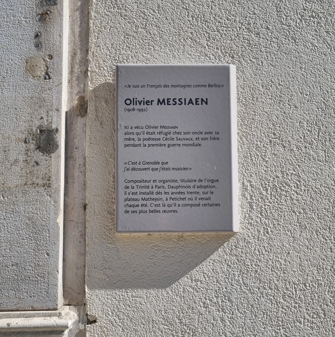 계속해서 뚜벅뚜벅 걸어가다 보면 또 예상치 못한 작곡가를 한 명 만날 수 있다. 그르노블은 베를리오즈와도 관련이 많은 도시지만, 베를리오즈를 존경하던 또 다른 하나의 프랑스 작곡가 올리비에 메시앙 (1908~1991) 과도 관련이 있는 도시다. 아직 너무 최근 분이시라 평가를 하기도 애매하고 내가 곡을 즐겨 듣지도 않는 작곡가지만, '시간의 종말을 위한 사중주' 나 '투링갈릴라 교향곡' '새의 카탈로그' 등 다양한 작품과 스케치가 남아 있는 분이시다. 무려 컬러 사진이 남아 있는 시대의 작곡가인 데다가 2차 세계대전에도 참전해 본 분이시라니. 메시앙은 여름휴가를 주로 그르노블에서 보냈었다고 한다. 언젠가 내가 현대 음악에 내성이 생긴다면 이 메시앙이 여름휴가를 보내던 집도 또 새롭게 보일까?