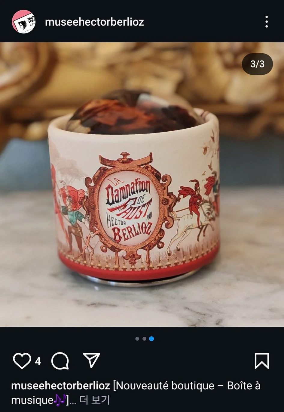 '파우스트의 겁벌'은 베를리오즈의 오페라 (베를리오즈는 '극적 전설'이라 부르기를 선호했고 오라토리오로 분류되기도 한다)로, 그 안에 나오는 '헝가리 행진곡'은 나름 베를리오즈의 곡 가운데 유명한 축에 속한다. 아니, 그런데, 파우스트의 겁벌인 주제에 껍데기가 이렇게 아름다울 수가 있나. 이렇게 분홍... 분홍하고 예뻐도 되는 건가? 파우스트는 지금 지옥의 업화에 휩싸여 죽어가고 있을 텐데... 하지만 그런 건 상관없을 정도로 껍데기가 아름다웠다! 둥그런 오르골 상자 위 베를리오즈의 초상화는 조금 부담스럽긴 했지만, La Damnation De faust... 베토벤 박물관과 모차르트 박물관에서도 이렇게 아름다운 오르골은 본 적이 없었다. 껍데기에 그 곡의 이야기를 담아주다니! 숨이 막힐 것 같았다. 불운한 것은 베를리오즈 박물관에서는 해외배송을 해 주지 않는다는 것이다. 아니 온라인샵이 아예 없어서 국내배송도 안 해준다. 그래도 혹시나 하는 마음에 나는 절박하게, '안녕하세요, 저는 베를리오즈에 무척 흥미가 많은 한국인입니다, 5월에 갔을 때는 오르골이 있냐 물어 없다는 답을 받고 무척 아쉬웠는데 나온 걸 보고 정말 너무너무너무너무 오르골이 갖고 싶어 연락드립니다 어떻게든 구할 수 있는 방법이 없을까요?'라고 인스타그램 DM을 보냈다. 무려 한 달이 지나서야 온 답변은 역시나 배송은 불가하다였다. 하지만 박물관은 그런 내 구구절절한 설명을 보고 연민을 느꼈는지 내게 비밀을 하나 귀띔해 줬다. 바로, 환상교향곡 오르골이 조만간 굿즈샵에 출시될 예정이라는 것이었다. 베를리오즈의 대표작, 내가 가장 사랑하는 교향곡 가운데 하나인 환상교향곡 오르골이 나온다니... 아, 교환학생을 1년 더 늦게 갔어야 했다. 환상교향곡 오르골, 생각만 해도 감격적이라서 가슴이 터져버릴 것 같다. 10만 원을 주고서라도 살 의사가 있는데, 혹시, 프랑스 리옹 근교에 살고 운전면허가 있는 분들, 시간이 있으시다면 이 불쌍한 대학생을 위해 오르골 대리구매 해주실 수는 없으신가요. 여러분들의 연락을 간절히 기다리고 있겠습니다.