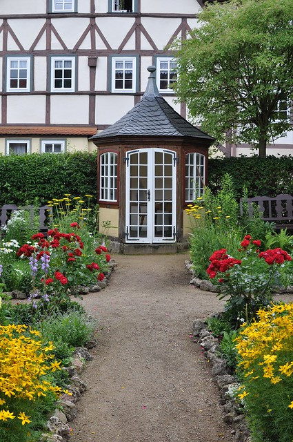 20분 정도 시대악기 연주회가 끝나고 나면 2층으로 올라가... 는 게 아니라 정원으로 나가서 1~2분 정도 거리에 있는 다음 방으로 이동해야 한다. 앞서 말했듯 내가 갔을 때는 비가 추적추적 내렸는데, 바흐박물관에서는 친절하고 사려 깊게도 이 방에서 다음 방으로 이동하는 사이 관람객들이 비를 맞을까 봐 우산꽂이를 비치해 두었었다. 우산꽂이 속 우산은 바흐 악보를 프린팅 해놓은 우산이었다. 바흐 팬이라면 한두 개쯤 사도 나쁘지 않을 장우산이다. 나야 우산이 있었기 때문에 따로 쓰지는 않았지만, 이 구관 전시실에서 우산을 집어 들고 특별전시실로 들어가면서 우산을 반납하면 된다. 바로 맞은편에는 전형적인 팀버프레임의 독일 가옥이 있고 낮게 깔린 잔디 가장자리를 자잘한 돌로 둘러놓은 작은 정원은 조용하고 평화로운 시골의 분위기를 그대로 담고 있다. 작은 정자도 하나 있는데 비가 오지 않았더라면 더 자세히 둘러봤을 것 같은 곳이었다.