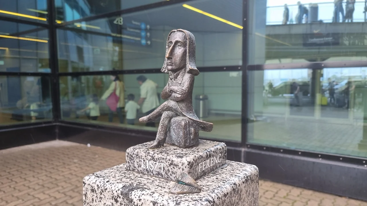 리스트 페렌츠 공항은 채광이 좋았던 기억이 난다. 내가 내린 터미널 가운데에는 피아노가 한 대 있었는데 두 번째로 부다페스트에 도착한 날 누군가가 피아노에 앉아 리스트의 그 유명한 '헝가리 광시곡 2번'을 치고 있었다. 아, 헝가리 부다페스트에서 듣는 헝가리 출신 작곡가 리스트 페렌츠의 헝가리 광시곡이라! 폴란드에서 손쉽게 '영웅 폴로네즈' 오르골을 구입했던 것처럼 헝가리의 '헝가리 광시곡' 오르골도 쉽게 구할 수 있겠다는 희망이 들었다. 공항에서 도심으로 이동하기 위해 버스를 타기 전 한 가지 꼭 보고 가야 하는 것이 있다. 바로 공항의 리스트 조각상이다. 200E 버스 탑승장 근처에 있는 이 조그만 조각상은 공항이 리스트의 이름을 달게 된 해이자, 리스트의 탄생 200주년을 맞이한 2011년 만들어진 미니조각상으로, 정말 내 손바닥만 한 크기의 조각상이라서 그냥 지나쳐버리기 쉽다. 다리를 꼬고 앉아 있는 리스트는 본인의 여행가방을 깔고 앉아 있고, 발치에는 아주 조그만 종이비행기가 하나 놓여 있다. 영국부터 페르시아, 러시아까지 종횡무진 연주여행을 다녔던 리스트가 공항에 있다는 것은 아주 자연스러운 일 같기도 했다. 앞서 바이로이트 박물관에서 '리스트라면 먼 길을 떠나온 여행자에게 곁을 잠깐 내주는 것 정도는 신경 쓰지 않았을 것이다'라는 취지의 말을 한 적이 있는데, 그와 마찬가지로 공항에서 방문객들을 맞이하고 떠나보내는 역할을 하고 있다는 것도 방랑했던 여행자 리스트에게 아주 적절하게 느껴졌다. 개인적으로는 리스트 박물관이나 리스트 공항에서 이 조각상을 인형, 키링 등 작은 굿즈로 제작해서 팔아 줬으면 좋겠는데 조각상을 만든 작가도 최근 작가고 해서 저작권 문제가 있는 건지 뭔지 팔지 않는 것 같다. 아쉬운 일이다.