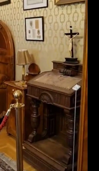 오른쪽 방은 리스트의 서재처럼 사용됐던 것으로 보인다. 노란색 벽지가 전체적으로 따뜻한 분위기를 풍겼고 작은 스피넷 정도, 3~4옥타브 크기의 피아노 두 대가 놓여 있었다. 위에는 아담 리스트, 리하르트 바그너처럼 리스트의 인생과 관련이 깊었던 인물들의 초상화와 사진이 걸려 있고 안쪽에는 리스트의 가구들이 잔뜩 놓여 있다. 특히 시선을 사로잡았던 것은 기도대. 리스토마니아 광풍을 불러일으키고 여자들을 실신시켰던 미남 아이돌 피아니스트였던 시절을 지났더니 사제가 됐다, 만화에서도 안 쓸 법한 설정인데 실제로 그런 사람이 있다. 어릴 적부터 리스트는 종교에 귀의할까 하는 생각을 종종 했고 결국 카롤린과의 결혼이 무산된 이후 아예 성직의 길로 빠져버렸다. 리스트가 사제가 됐다고 했을 때 많은 사람들이 코웃음을 쳤다고 하는데, 나 같아도 1군 아이돌이 갑자기 머리 깎고 절로 들어갔다고 하면 '퍽이나 종교생활을 잘하겠다'라는 생각이 들었을 테다. 사위도 "무슨 중죄를 지었길래 성직에 들어가야만 씻길 정도인 걸까"라는 식으로 말했고 바그너도 비웃었다고 한다. 하지만 남들이 어떻게 생각하든 리스트는 진심이었고, 그 진심은 리스트의 편지나 일기를 읽어만 봐도 충분히 알 수 있다. 아내가 될 뻔했던 카롤린이 후일 정통 가톨릭 시점에서는 이단이라고밖에 볼 수 없는 책을 출판하자 불편한 기색을 내비치기도 했고, 신학적인 내용으로 싸우다가 유리창을 주먹으로 부순 적도 있다고 전해진다. 태어나서 신의 존재를 한 번도 믿어 본 적 없는 내게는 이해가 잘 가지 않는 이야기지만, 무엇인가를 열정적으로 믿는 것이 아무것도 믿지 않는 것에 비하면 훨씬 행복한 일이라고 생각하기 때문에 그의 열정은 그런대로 긍정적으로 생각하려 하고 있다. 기도대 바로 위에는 예수 그리스도를 그린 그림이 걸려 있고 그 옆에는 리스트가 수단 안쪽에 꿰매고 다녔던 사제 서품 임명장 같은 것이 놓여 있다. 설명을 들은 지 시간이 꽤 흘러 무엇이었는지 정확하지는 않지만... 가슴과 가까운 위치에 꿰매고 다녔던 것이라면 분명 리스트에게 소중한 종이였을 것이라고 생각한다.