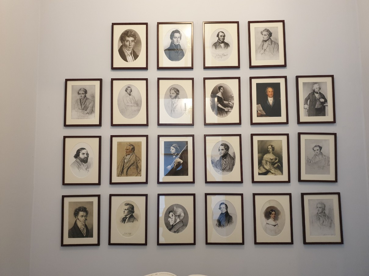 삐걱거리는 계단을 올라오고 나면 이번에는 삐걱거리는 바닥과 멘델스존의 집이 우리를 맞이한다. 한 걸음을 옮길 때마다 관람객이 별로 없는 바람에 나 혼자뿐인 공간에 삐걱거리는 소리가 유달리 크게 울려 퍼진다. 귀신이 나올 것 같다. 하지만 귀신이 나온다면 아마도 멘델스존 귀신이 나올 테니까 오히려 좋은 일이 아닐까. 처음 우리를 마주하는 작은 방 세 개는 각각 작곡가로서의 멘델스존, 멘델스존의 친구와 동료들, 그리고 멘델스존의 롤모델들을 다루고 있다. 이 작은 방 세 개는 보면대처럼 생긴 설명문들을 가운데에 두고 있다. 멘델스존의 1834년 초상화만이 앞에 걸려 있는 '작곡가로서의 멘델스존 방'에서는 멘델스존의 온화하게 웃는 모습과 시선이 느껴져서인지, 정말로 멘델스존이 방문객이 설명을 다 읽을 때까지 천천히 기다리며 안내해 주는 기분이 든다. 방이 크지 않고 주변 벽 색깔도 어두운 색이 아니라 밝은 색이라 그런지 압도당하는 기분이 아니라 집주인과 대화를 하면서 차 한잔을 마시는 것만 같다. 전체적으로 어두운 벽이 많아 숭고하고 위엄 있는 분위기였던 반프리트 (17화 참고) 와는 대조적인 분위기다. 옆 방, 멘델스존의 친구와 동료들 방에는 22명의 초상화가 걸려 있는데 초상화를 보고 이름과 멘델스존과의 관계를 바로 읊을 수 있는 사람이 절반 정도밖에 되지 않아서 무척 자존심이 상했다. 멘델스존 공부를 아직 할 거리가 많이 남았음을 절감하게 되는 순간이다. 예니 린트, 요한 볼프강 폰 괴테, 요제프 요아힘, 로베르트와 클라라 슈만처럼 유명한 사람들도 있지만 정말 멘델스존의 친구들을 모아놓은 자리기 때문에 익숙하지 않은 얼굴도 너무나 많다. 한 장 한 장을 넘기면 초상화 속 인물들의 이야기가 하나하나 나와 있다. 별 게 아닌데도 초상화 아래에 단순한 설명을 붙여놓는 것이 아니라 페이지를 하나하나 넘기고 있으면 멘델스존의 인생을 들춰보는 것 같은 기분이 들어서 행복해진다. 마지막 멘델스존의 우상 칸에는 너무나 예상 가능한 바흐를 비롯한 다양한 작곡가들에게서 멘델스존이 받은 영향을 정리해 준다.