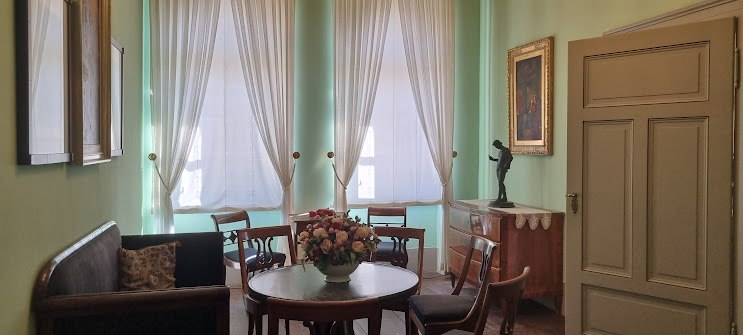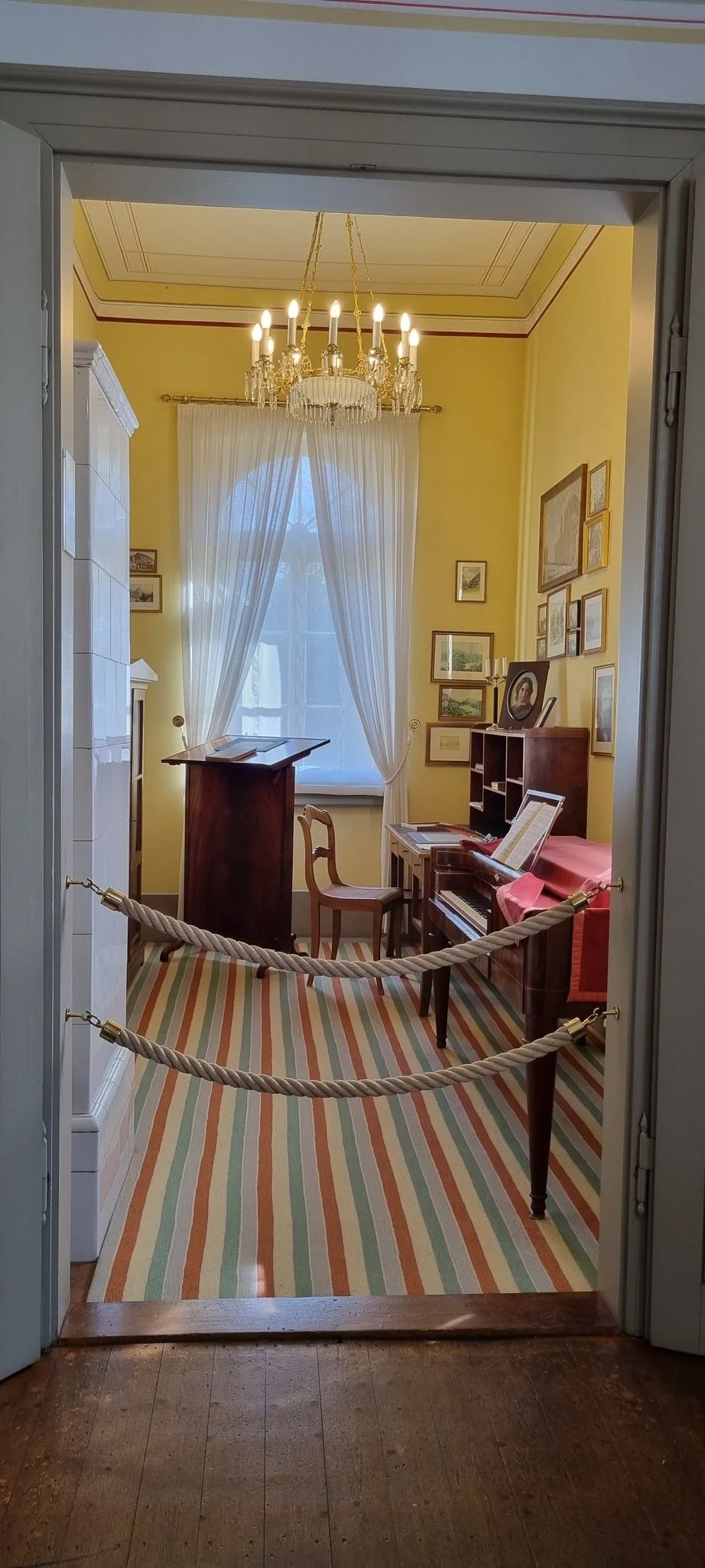 원래 관람 동선을 따라가면 멘델스존의 서재부터 관람해야 하지만, 나는 멘델스존의 서재라는 아이코닉한 공간은 늘 방문의 마지막으로 미뤄놓기 때문에 다른 방들부터 먼저 탐방하도록 하자. 여섯 번째 방은 네 번째 방과 마찬가지로 마호가니 나무와 체리나무로 만들어진 가벼운 갈색 나무와 부드러운 초록색 벽지가 돋보이는 거실이다. 특기할 만한 점은 루소와 볼테르의 흉상이 있다는 것 정도 아닐까. 아니다. 오히려 부드러운 초록색 벽지에 대해서 이야기를 해보자. 멘델스존의 수채화를 몇 번 본 사람이라면 다들 알겠지만 멘델스존의 수채화에서 가장 돋보이는 색은 종종 초록색과 파란색이다. 특히 이탈리아 피렌체의 두오모 성당을 그린 멘델스존의 그림 같은 경우, 두오모 성당의 특징적인 붉은 지붕에도 불구하고 멘델스존은 붉은색을 아예 날려버렸다. 그래서 나는 멘델스존이 초록색이나 파란색을 좋아하지 않았냐는 합리적인 의심을 오랜 시간 해왔는데, 일부 논문에 의하면 실제로 멘델스존이 가장 좋아하는 색은 초록색이었다고 한다. 멘델스존 집안에서는 책을 새로 장정할 때 초록색 가죽을 썼다고 하는데, 아마 이것이 펠릭스에게도 그대로 습관으로 내려온 것 아닐까. 펠릭스 멘델스존도 보통은 책을 따로 장정하지 않았지만 본인만의 책으로 새로 장정하고 싶을 때는 초록색 가죽으로 장정했다고 한다. (현대에는 책을 새로 장정하는 일이 거의 없어서 나도 정확히 어떤 의미인지는 모르겠지만, 커버를 새로 덧씌우는 느낌이라고 생각하고 있다.) 차분하지만 생기가 넘치고 온화한 색감이니 멘델스존과 잘 어울리는 색인 것 같기도 하다. 세실 멘델스존의 기록에 의하면 펠릭스 멘델스존은 어떤 가구를 살지, 어떤 그림을 걸지, 그림을 건다면 어디에 걸지 따위를 전부 세심하게 지시하는 사람이었다. 현대에도 인테리어는 아내에게 전적으로 맡겨두는 사람들이 꽤 많다는 것을 고려해 보면 멘델스존이 얼마나 지독하게 섬세하고 꼼꼼했는지 (조금은 피곤할 정도로) 바로 느껴진다. 그러니 아마 복원 시 남아 있는 벽지를 참고해서 새로이 칠한 이 색감들도 멘델스존이 하나하나 직접 지시한 색감이지 않을까, 싶다.