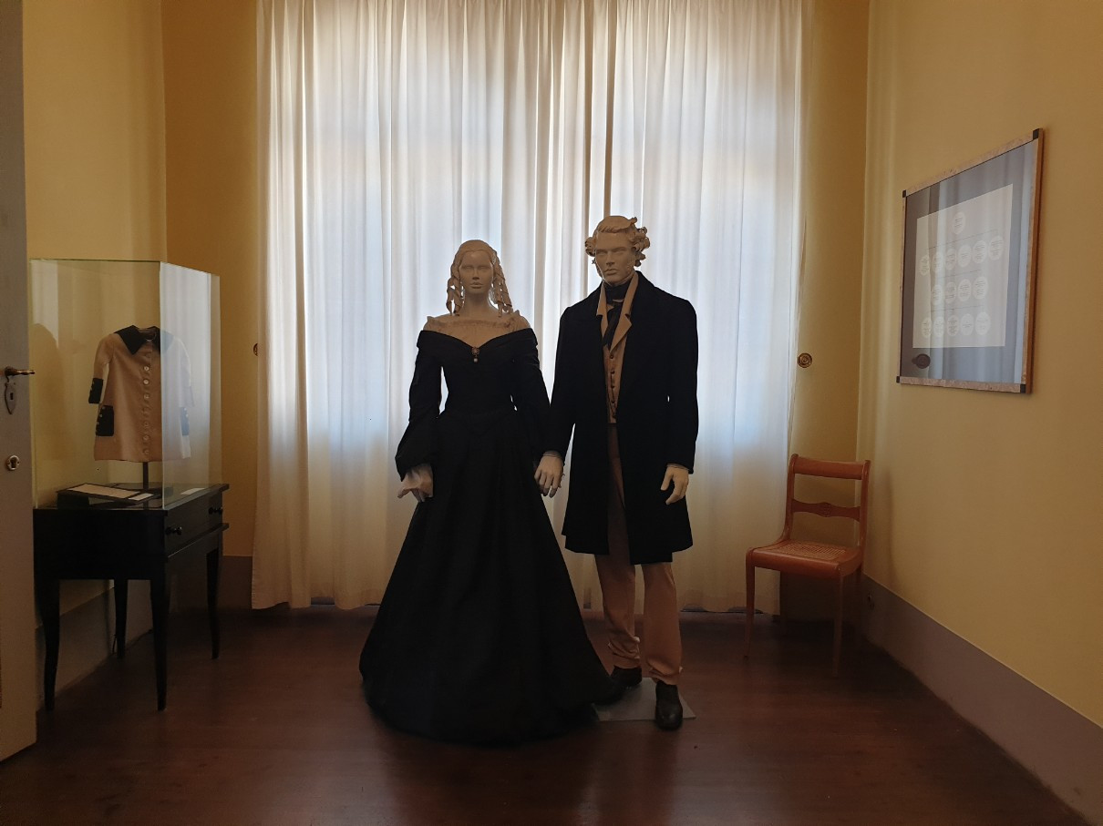 문제는 멘델스존은 어마어마하게 눈이 높은 사람이었다는 것이다. 느꼈겠지만 그는 지독한 완벽주의자였다. 누이들도 부모님도 너무 눈이 높아서 평생 결혼을 하지 못하는 건 아닐까 걱정을 했다고 한다. 그런데 그렇다고 또 여자를 소개받는 것도 싫단다. 신붓감을 찾아 헤매는 건 야만인들이나 하는 거라고, 자기는 못 찾으면 그냥 결혼을 안 할 거라고 하며 외로움과 상실감에 떨면서도 기준을 굽히지 않던 멘델스존은 천만다행으로 1836년, 아픈 친구를 대신해서 합창단을 지휘하러 갔다가 그 높은 기준에 들어맞는 여자를 만나게 된다. 무려 8살 연하의 (이거 완전 도둑놈이다) 아름다운 열아홉 살 소녀, 세실 장르노. 만난 지 4개월 만에 청혼을 한 멘델스존은 그로부터 6개월 뒤 결혼식을 올린다. 번갯불에 콩 구워 먹듯이 결혼을 했지만 놀랍게도 행복한 결혼이었다. 부부는 그림이라는 공통의 취미를 갖고 있었고 남편 쪽이 스케치해 놓은 그림을 아내가 채색으로 완성해 버리는 일도 있었다고 한다. 세실은 종종 멘델스존에게 그림을 선물해 주었는데, 전시품 중에서도 세실이 프랑크푸르트 풍경 그림을 그려 장식해 준 방문카드 홀더가 있다. 멘델스존의 그림은 12번 방에서, 세실의 그림은 정원의 새로운 상설전시실에서 확인할 수 있는데... 멘델스존의 그림 이야기는 이미지로 대체하고, 세실의 그림 이야기는 나중에 더 자세히 하자. 둘 사이에는 자식이 다섯 있었고, 그 다섯의 초상화도 확인할 수 있다. 이 초상화 가운데 첫째와 둘째 카를과 마리는 멘델스존 어린이박물관의 마스코트 캐릭터로 사용되고 있다. 특히 첫째 카를이 아기일 때 입던 옷이 카를에게 멘델스존이 보낸 편지와 함께 전시되어 있어 박물관 마스코트 카를은 늘 이 아기옷을 입고 있는 채로 그려진다.