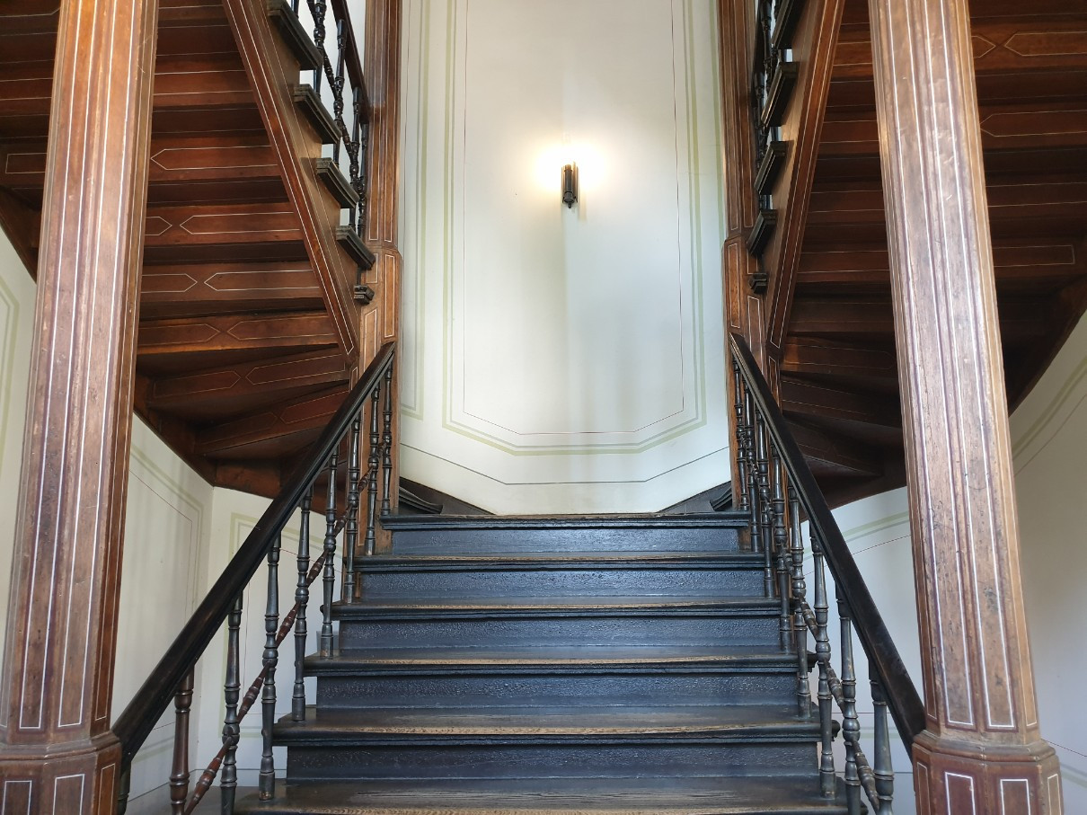 1층으로 올라갈 차례다. 드디어 멘델스존이 살던 공간으로 올라가는 것이다! 전시실을 나가 연결되는 계단으로 올라가기 직전 갑자기 1831년 멘델스존 초상화로 만든 멘델스존 등신대 입간판을 마주치게 된다. 솔직히 그윽한 눈빛이 좀 부담스럽다. 하지만 박물관에서 이렇게 작곡가 등신대 입간판을 세워놓는 경우가 많은 건 아니다 보니까 웃음이 피식 나오긴 한다. 멘델스존 등신대를 뒤로하면 1845년부터 그대로 보존되어 온 나무계단이 우리를 맞이한다. 계단을 한 칸 올라갈 때마다 삐걱삐걱거리는 소리가 난다. 바흐박물관의 계단은 이렇게 보존되지 않았었기 때문에, 2022년 6월 멘델스존하우스를 방문했던 내게는 처음 들어보는 삐걱거림이었다. 한 걸음을 밟을 때마다 나무가 약간, 아래쪽으로 탄력 있게 휘는 느낌이 들었다. 삐걱거리는 소리가 너무 커서 혹시 내가 계단 밟았다가 나무 판이 부러지고 나는 떨어지고 박물관에서는 내게 배상을 청구하는 게 아닐까 하는 두려움까지 느껴졌다. 2022년 6월 같이 간 친구와 나 둘 다 삐걱거림에 '생명의 위협을 느꼈다'라고 중얼거렸고 나보다 먼저 이탈리아에 교환학생을 다녀왔던 친구도 (비발디를 좋아한다) 자기도 멘델스존하우스를 방문했을 때 삐걱거리는 계단에 생명의 위협을 느꼈다고 고백했다. 원본 계단을 보존하는 건 정말 좋지만 그 삐걱거림이 무섭긴 하다. 빈의 다른 박물관 계단들도 꽤 삐걱거리긴 했지만 아직도 멘델스존하우스에서 처음 오래된 계단을 밟으며 느꼈던 충격은 잊히지가 않는다. 하지만 계단이 Y자 형태라서 두 갈래로 내려오거나 올라갈 수 있다는 점은 정말로 마음에 든다. 일자로 내려오는 계단에는 멋이 없다. 1840년 리스트가 라이프치히에 왔을 때 높은 티켓 가격으로 인해 성난 라이프치히의 민심을 달래기 위해 멘델스존 부부가 연회를 열어줬다고 하는데, 그때 참석자 중 한 명은 세실 멘델스존에 대해 "멘델스존 부인께서는 순백의 드레스를 입고 천국에서 온 방문객처럼 손님들 사이를 왔다 갔다 했다."라고 남겼다. 이런 Y자형 계단에서는 그렇게 내려오는 효과가 배가되겠지...라고 생각하며 생명의 위협으로 인해 두근거리는 심장을 다스렸던 기억이 난다.