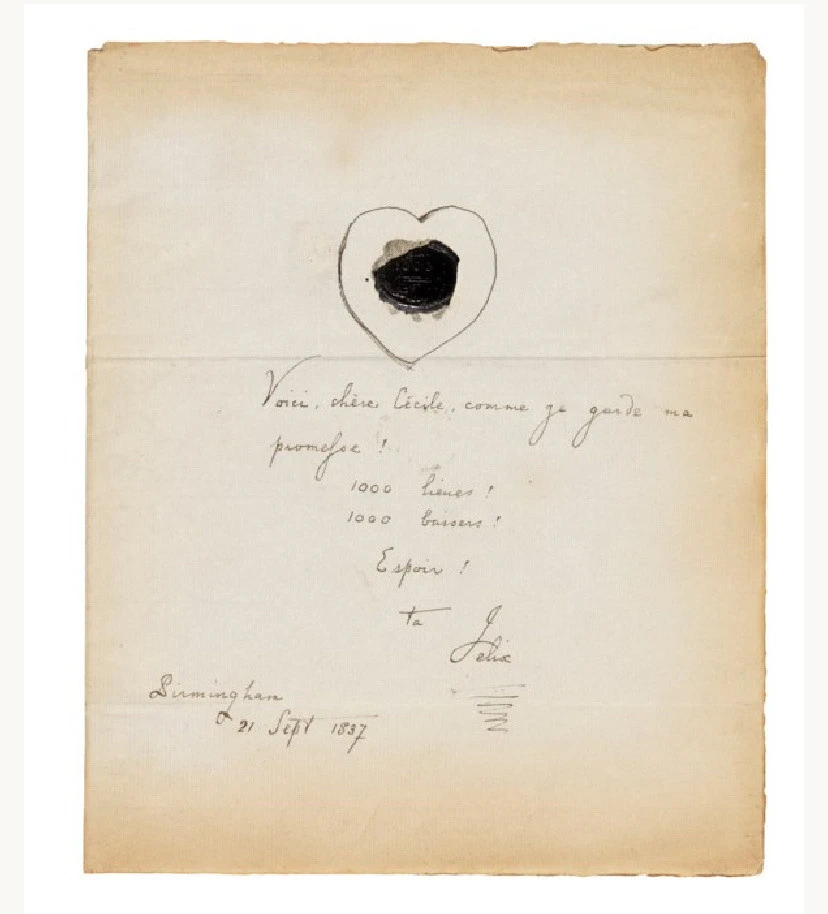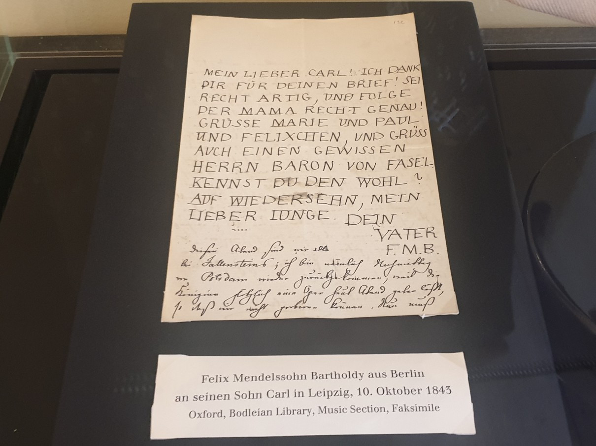 카를의 옷도 옷이지만, 그보다도 나는 멘델스존이 아들에게 보낸 편지를 더 좋아한다. 어떤 면에서는 멘델스존하우스에 있는 모든 전시품들 가운데 가장 좋아하는 전시품이다. 편지는 두 부분으로 나뉘어 있다. 아랫부분은 평범하게 아내에게 보내는 부분이라서, 평소의 글씨체로 유려하고 우아하게 쓰인 반면 윗부분은 여섯 살배기 아들에게 보내는 것이라서 그런지 알파벳 하나하나가 또박또박 끊겨 적혀 있고 무엇보다 전부 대문자로 쓰여 있다. 영어 기준으로 보통 네 살 정도가 되면 아이들이 소문자를 배우기 시작한다는데, 아마 여섯 살 아이에게는 여전히 소문자보다는 대문자가 읽기 편할 테니 그 점을 고려해서 아들이 읽을 수 있는 대문자로 써준 모양이었다. "사랑하는 우리 카를! 편지 고맙구나. 엄마가 하는 말 잘 듣고 있지! 마리랑 파울이랑 아기 펠릭스에게도 안부 전해주렴, 그리고 폰 파젤 남작님에게도. 그분이 누군지 알려나 모르겠네? 그럼 우리 사랑하는 아들, 안녕. 너희 아버지, F.M.B"라고 적혀 있는 아주 간단한 편지다. 내 짧은 독일어 실력으로도 대충 번역이 가능한 정말 쉽고 사랑스러운 내용이다. 그 밑에 쓰인 내용은 전혀 해독할 수가 없었지만 한 장의 편지만으로도 아들을 향한 사랑과 배려가 느껴져서 마음이 몽글몽글해진다. 주위에서 누구나 부러워할 행복한 가정을 두고 서른여덟의 나이에 요절해 버리다니... 정말 나쁜 아버지다.