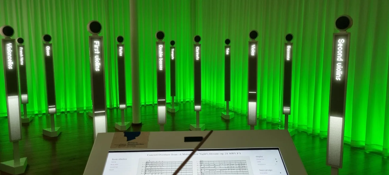 그 아쉬움을 조금이나마 해소해 주는 곳이 멘델스존하우스의 이펙토리움이다. 이펙토리움은 2014년 설치된 체험형 전시로, 멘델스존의 합창곡과 멘델스존의 기악 음악 두 가지 종류를 직접 지휘해 볼 수 있다. 각각의 악기나 성부의 소리가 나오는 스피커들 십수 개가 놓여 있고, 체험자는 보면대 앞에 서서 지휘봉을 들고 속도나 볼륨을 조절할 수 있다. 보면대에 센서가 있기 때문에 보면대의 센서를 중심으로 해서 동작을 수행해야 가장 원하는 효과를 잘 누릴 수 있다. 2024년 6월 같이 갔던 친구는 지휘를 공부한 친구였는데, (이 친구가 글 맨 위에서 언급한, 나보다 심각한 멘델스존 오타쿠인 친구이다. 휴대폰을 도둑맞은 나를 대신해 멘델스존하우스의 사진을 꼼꼼히 찍어줬다. 이 포스트에서 쓴 대부분의 사진은 이 친구가 찍어준 것이다) 아무래도 센서가 보면대의 한정적인 공간 안에서만 작동하다 보니 정작 배운 대로 온몸을 써서 지휘하면 센서가 조금도 작동하지 않는 모습을 볼 수 있었다. 말러처럼 온몸을 써서 지휘하지 말고 리하르트 슈트라우스처럼 팔만 까딱까딱해야 오히려 이펙토리움의 효과를 제대로 누릴 수 있다는 것이 좀 웃긴 점이다. 나는 내가 좋아하는 멘델스존의 '한여름 밤의 꿈 서곡'을 지휘해 봤었다. 내가 지휘를 하면 한 가지 속도를 유지하는 것이 상당히 어려워서 나중에는 그냥 바통을 옆에 내려놓고 전체 곡을 1.2배속으로 재생하기 버튼을 눌러둔 뒤 그냥 이펙토리움 한구석에 앉아서 음악을 감상했던 기억이 난다. 이펙토리움은 오히려 지휘 전공자들보다는 일반인들이나 아이들이 좋아하는 곳인 것 같았다. 2022년 6월에 같이 갔던, 음악보다는 미술을 훨씬 좋아하는 친구는 오히려 이펙토리움에서 꽤 즐거운 시간을 보냈으며 2024년 2월에 갔을 때는 삼십 분이 넘게 열 살 언저리의 남자아이가 이펙토리움을 점령하고 있었다. 내게는 멘델스존 음악 몇 곡을 파트별로 따로 틀 수 있는 스테레오 룸에 불과했지만 체험을 좋아하는 사람과 함께 가거나 동행자 가운데 어린아이가 있다면 이펙토리움에서 분명 즐거운 시간을 보낼 수 있을 것이다.