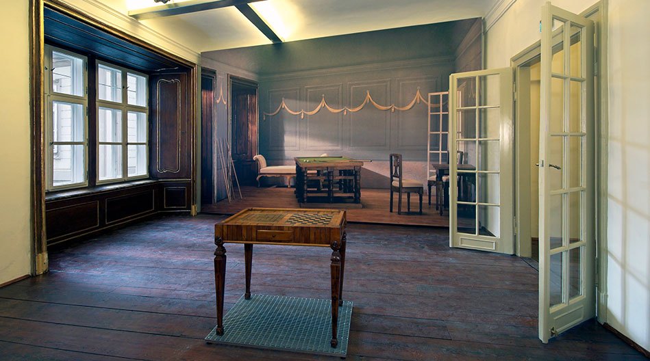 모차르트의 게임방, 응접실. 벽에는 상상도 그림이 걸려 있다. 이 방에 다른 전시품은 없다. 부끄러울 일이다. (출처: Vienna pass)