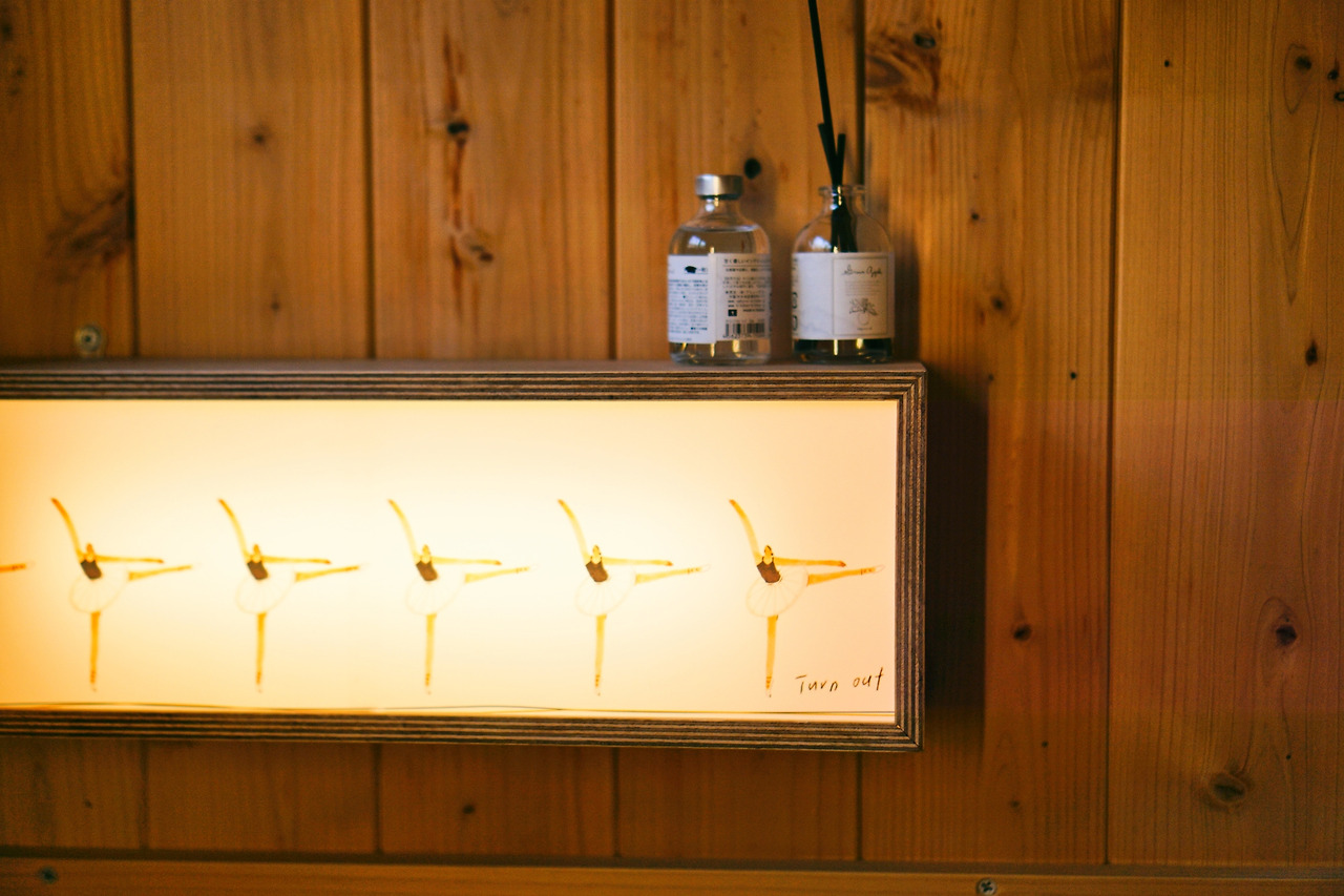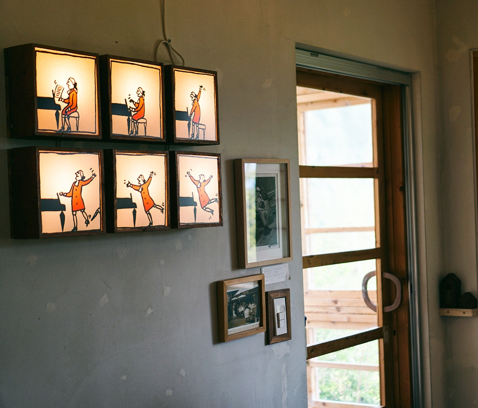 나무 박스 틀 안에 그려진 귀여운 그림과 조명
