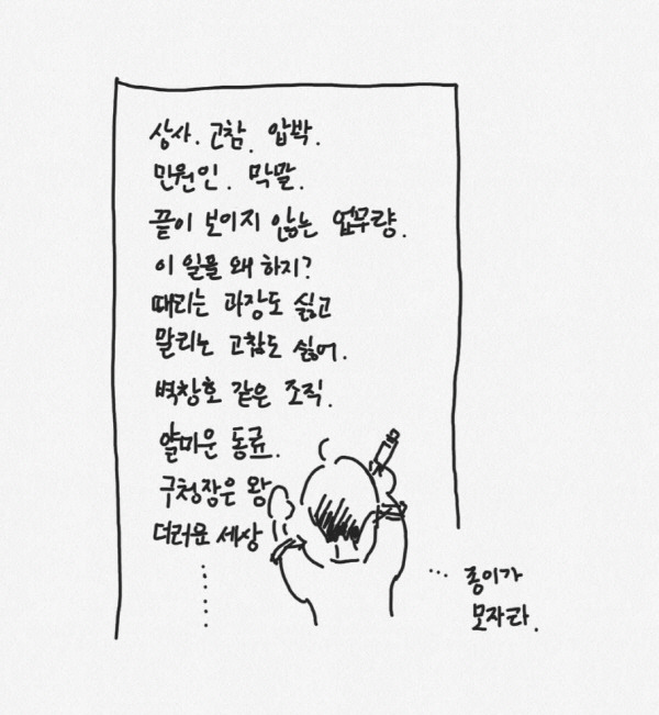둘째, 지금 하고 있는 공무원 일이 왜 이토록 힘든지 깊이 생각해 보고, 백지를 꺼내어 여러분을 힘들게 하는 요소가 무엇인지 종이에 검은 펜으로 차분하게 써 볼 것을 권한다. 상사와 고참이 날 힘들게 하는가? 동료와 사회복무요원이 날 힘들게 하는가? 민원인이 날 힘들게 하는가? 사람들이 나 보고 싸가지가 없다고 하는가? 일을 못한다고 질책하는가? 모두 다 나를 욕하는 것 같은가? 도움을 청할 사람이 도무지 보이지 않는가? 조직문화가 답답한가? 업무량이 너무 많은가? 업무 강도가 너무 하드한가? 일에서 의미를 찾을 수 없는가? 아니면 이 모두에 다 해당하는가?