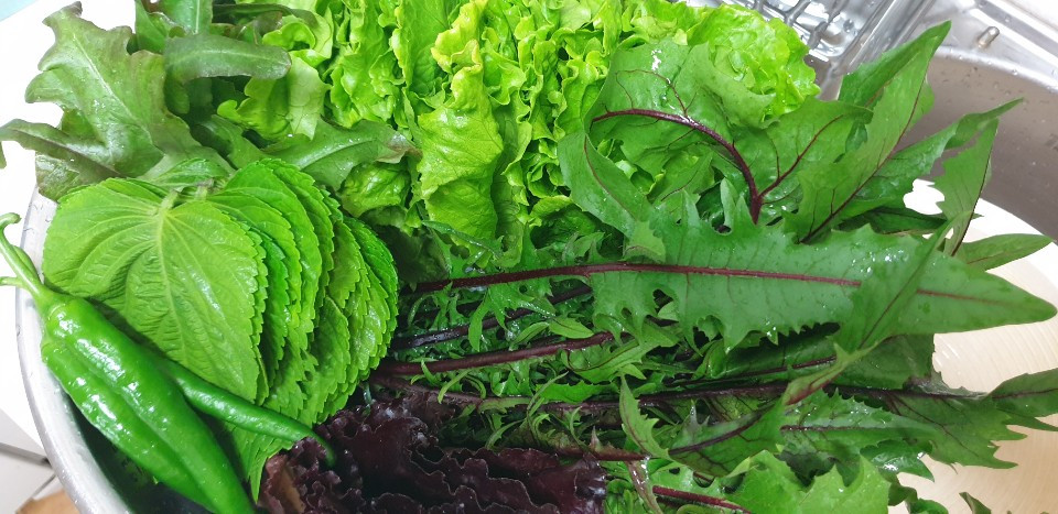 수확한 쌈채소 밭에서는 고추가 열리기 시작했고, 깻잎은 늦게 자라는 듯했지만 금세 손바닥 만한 잎이 되었다. 깻잎과 고추를 수확하니 먹을 채소가 훨씬 더 많아졌다.