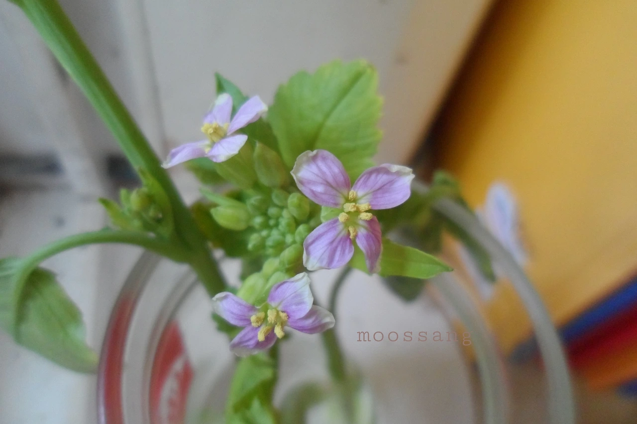 꽃이 피기 전에 열무 수확을 해야 하는데, 밭주인(제가 ^^;) 이 수확시기를 놓쳐서 열무를 뽑지 않으니 꽃 봉오리가 생겨버렸다. 그대로 두면 종자를 받을 수도 있겠지만, 나는 연한 열무를 먹을 생각에 서둘러 수확을 했다. 김치를 하려고 손질하다 보니, 꽃대가 남아 있길래 물에 꽂아두었다.