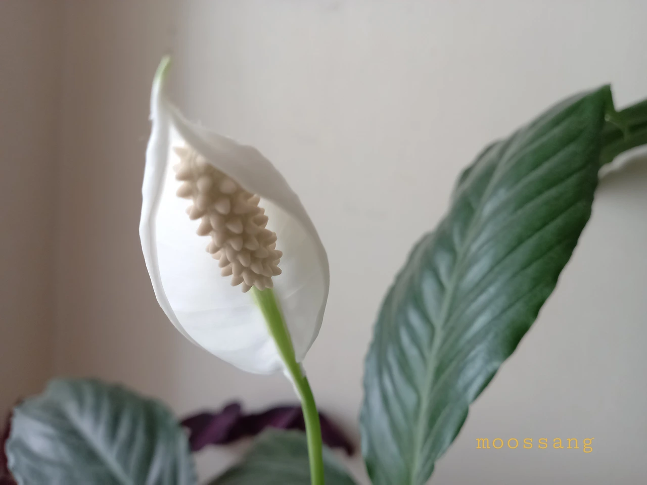 그런데 꽃이 핀 스파티필름은 다른 것이었다. 수경재배를 한 것 중에 신통치 않아서 다시 흙에 심은 작은 포기였다. 별 탈 없이 잘 지내더니 얼마 전부터 잎이 넓어지며 많이 건강해졌다. 그러더니 첫 꽃을 피웠다.