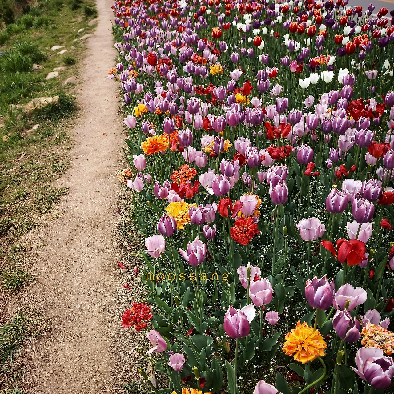 튤립꽃밭을 발견했을 땐 아무것도 없는 맨땅에 '튤립이 자라고 있어요.'라는 팻말이었다. 꼬박 한 달이 지나자 급한 성미를 가진 몇 송이가 보이더니 금방 화려한 왕관 모양의 꽃잎이 사람들을 붙잡았다. 탐스럽게 핀 꽃을 여러 번 만날 수 있을 듯했지만 그러지 못했다.