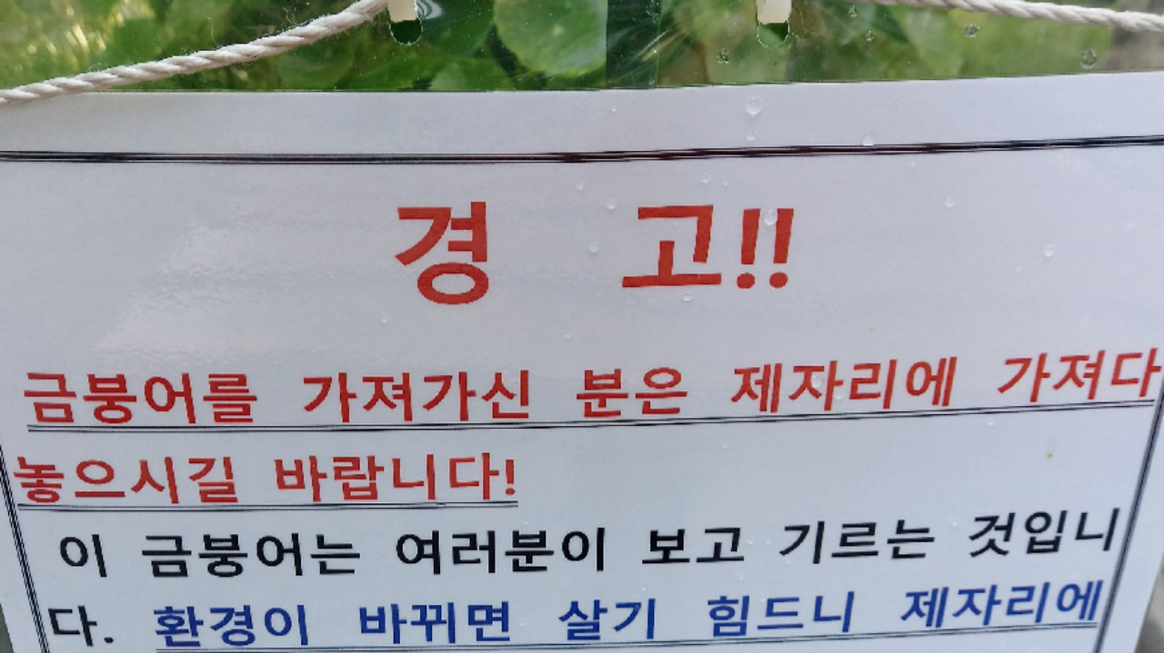 금붕어를 가져가신 분을 제자리에 가져다 놓으시길 바랍니다. 이 금붕어는 여러분이 보고 기르는 것입니다. 환경이 바뀌면 살기 힘드니 제자리에 가져다 놓으시길 바랍니다.