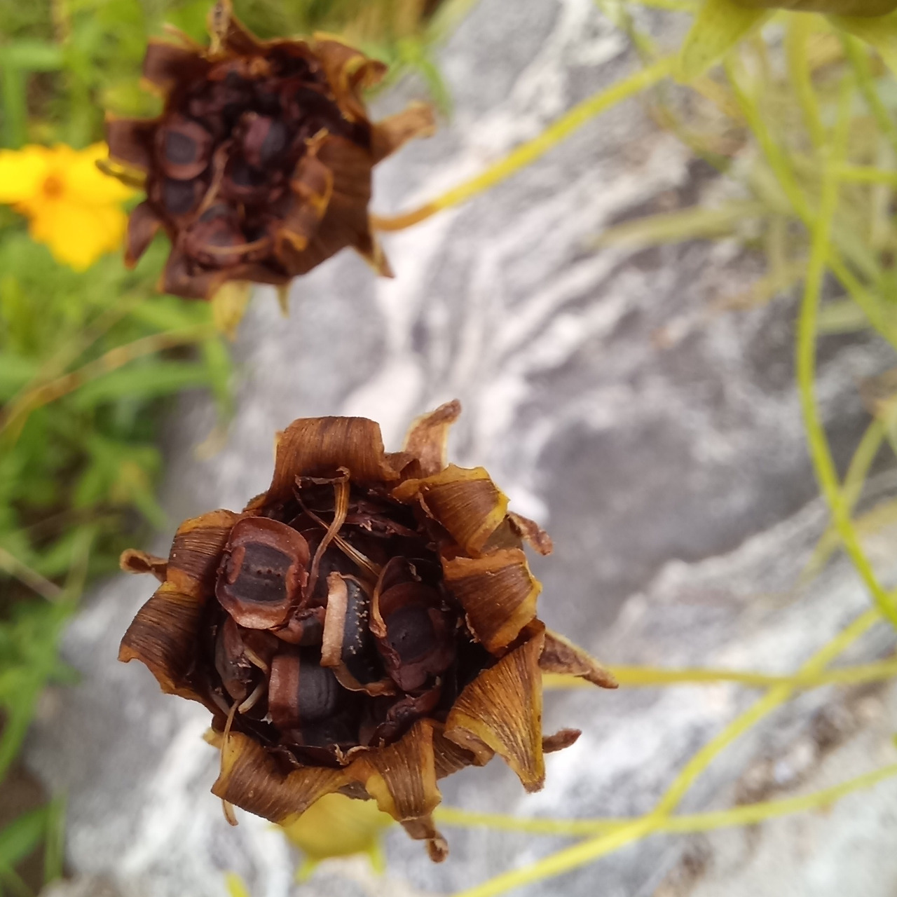 씨앗으로 꽉찬 모습과 씨앗을 다 떨어뜨린 모습 (금계국) 씨앗을 남기고 가는 꽃은 미련 둘 것이 없어 보였다. 유산처럼 남긴 씨앗 꾸러미에 남길 수 있는 모든 것을 넘겨주고 홀가분하게 말이다. 꽃잎이 떨어진 꽃차례엔 남기고 간 씨앗이 가득 들어있었다. 마치 보물섬에 숨겨둔 금단지처럼 금화가 가득 차 넘칠 듯 쏟아졌다.
