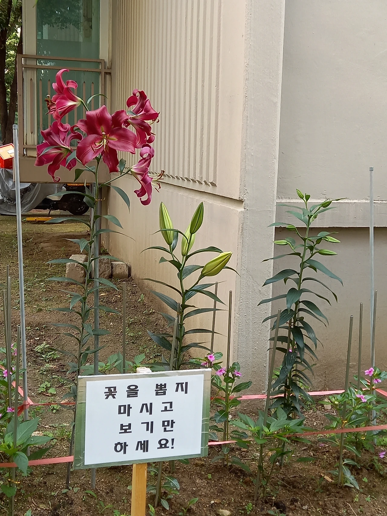 백합이 핀 정원은 아파트 관리사무소 앞마당이다. 부지런한 손 덕분에 정원은 날마다 꽃을 피운다. 그런데 백합이 피자 곳곳에 없던 팻말이 달렸다.