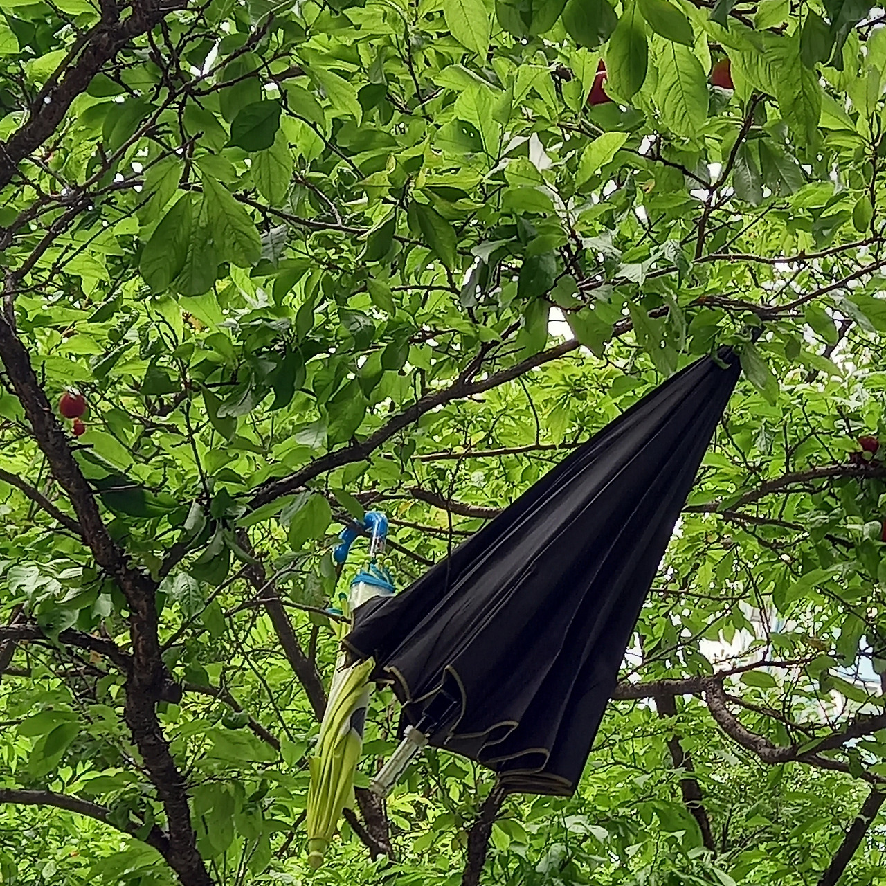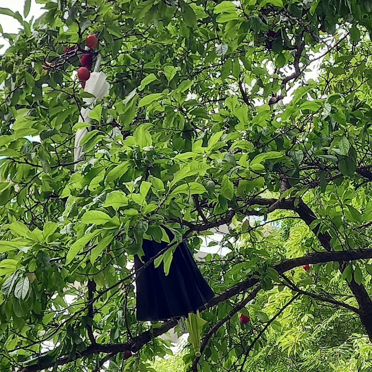 며칠 뒤 다시 가보니 우산 두 개는 사라지고, 하얀 우산만 남아 있었다. 그 높은 곳에 우산은 어떻게 꺼냈을까? 알쏭달쏭 나의 호기심을 끄집어내듯 추리력을 발휘해봤다. 그러고 보니 며칠 사이 버찌 같던 자두들은 온데간데 없어졌다. 나무와 마주 보고 있는 집에서 땄을까? 사다리차라도 갖고 와서 따갔을까? 혼자서 여러 가지 가설을 세웠지만 확인할 방법은 없었다. 떨어진 자두는 누가 베어 먹었는지 먹다 말았다. 이런 소동이 자두농장 주인인 듯 괘씸해지다가도, 어떻게 그 높은 가지에 자두를 손을 데는지도 궁금했다.