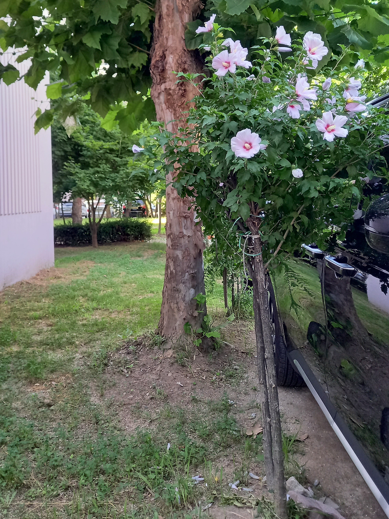 무궁화 옆은 명당처럼 날마다 그 자리를 노리듯 차가 세워져 있다. 차 주인들은 꽃을 한 번이라도 보았다면 주차를 더 신경 쓸거라 믿는다. 나라꽃을 모르는 사람은 없으니까 말이다. 나에게도 그 무궁화는 소중하고 특별한 나무가 되었다.