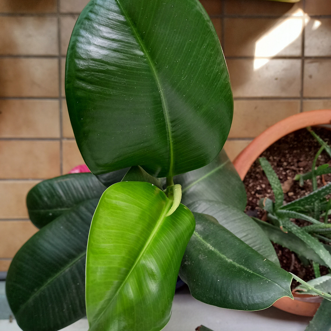 초복이 되자 아주 큰 잎이 돋아났다. 그리고 중복이 되기도 전에 두 개나 더 새로 났다. 더운 날씨로 다른 식물들은 매일매일 시들시들해진 잎을 흔들며 물을 달라고 했지만, 고무나무는 전성기를 맞은 듯 팔팔해졌다. 기회가 없어 펼치지 못한 듯 싱그럽고 건강한 새 잎이 계속 돋아냈다.