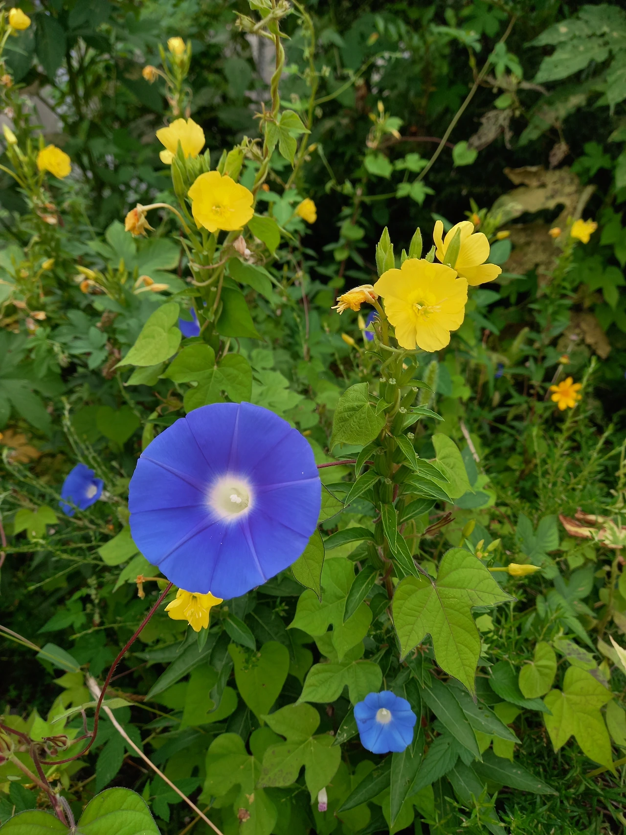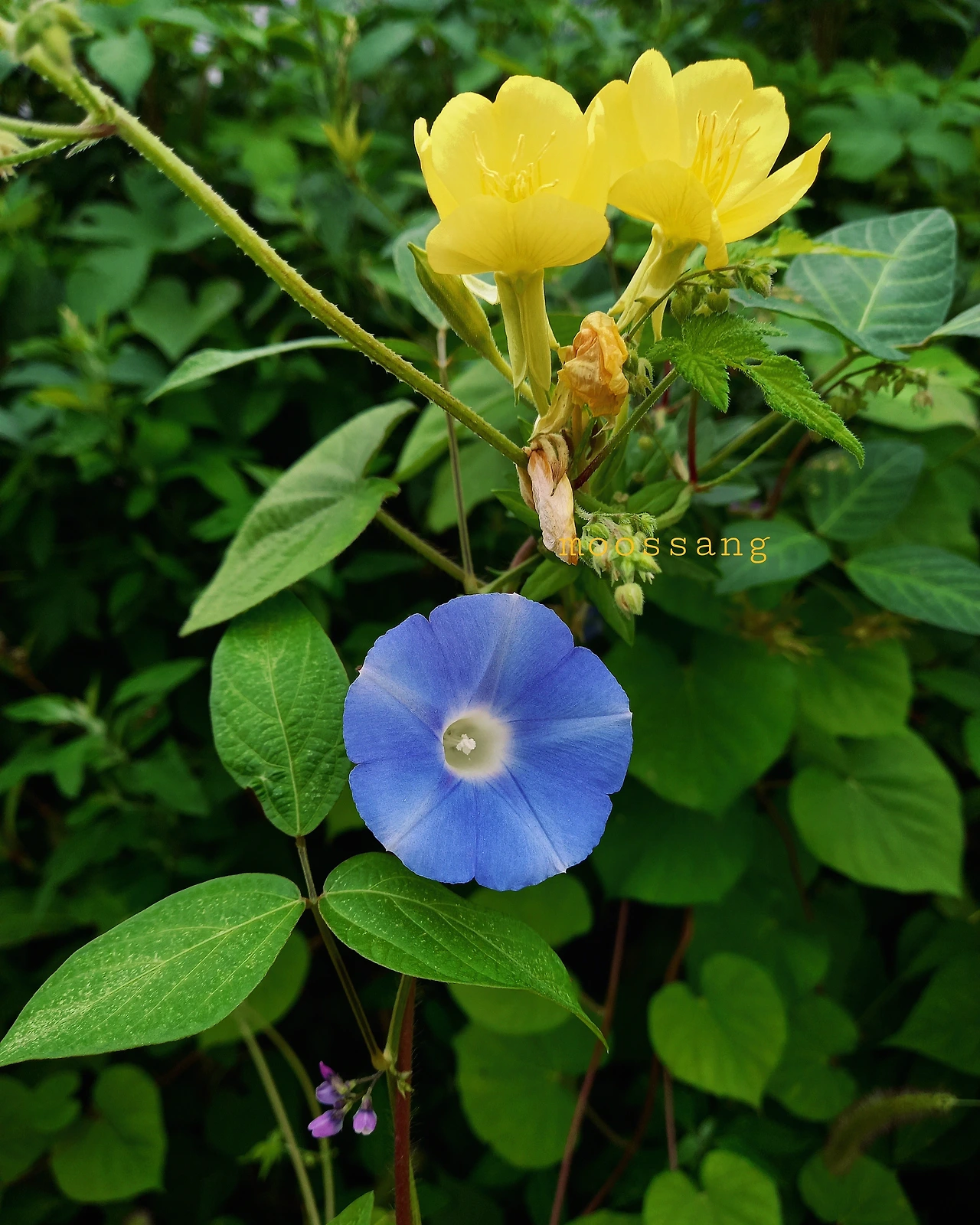 마치 삼총사처럼 노란 달맞이꽃과 하늘색 나팔꽃, 그리고 자주 보라색 돌콩 꽃이 나란히 피었다. 엉긴 모습은, 어느 줄기에서 핀 꽃인지 금방 찾지 못할 만큼 한 몸처럼 보였다.