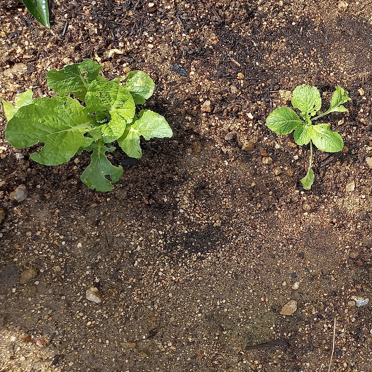 무와 배추 모종은 대부분 살아난 듯했다. 아직 기운 없이 그대로인 배추 모종은 3개 정도였고, 나머지는 손바닥 만하게 자랐고 속잎도 여러 장 올라왔다.