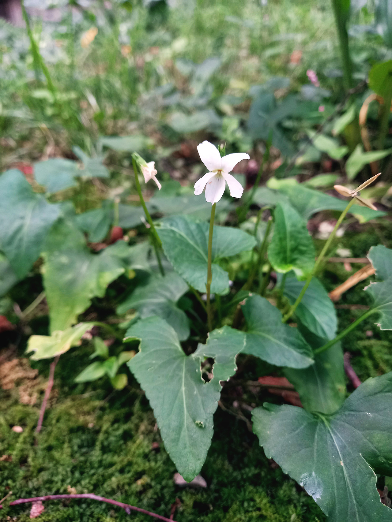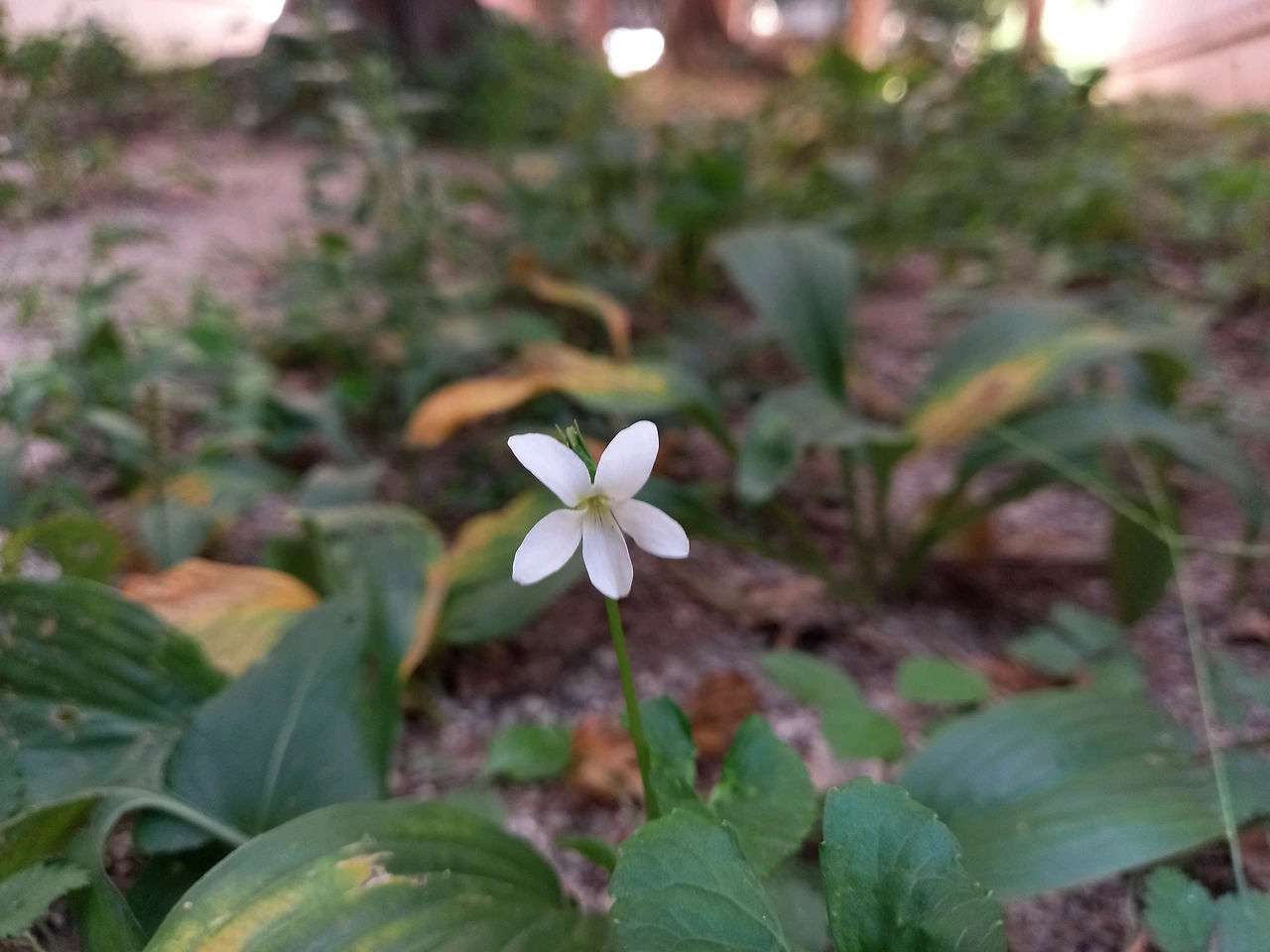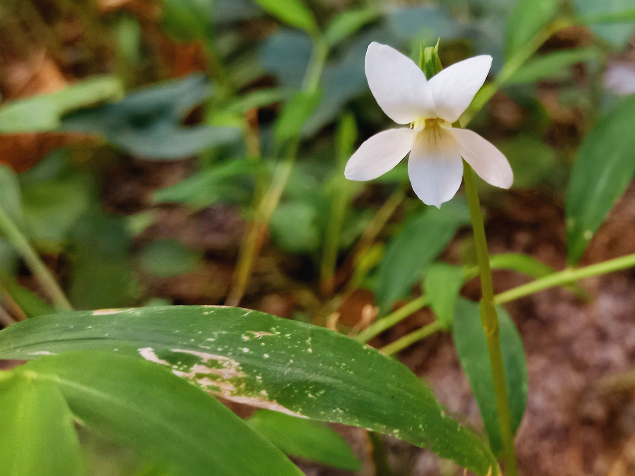 청단풍나무 숲에 흰 제비꽃이 피었어요. 지금이 봄인 것 같지만 사실은 가을이랍니다. 제비꽃은 봄에 피는 꽃이라고 알고 있지요? 이 꽃은 보라색 제비꽃이 아니라 흰 구름같이 새하얀 꽃잎을 한 흰 제비꽃이네요.