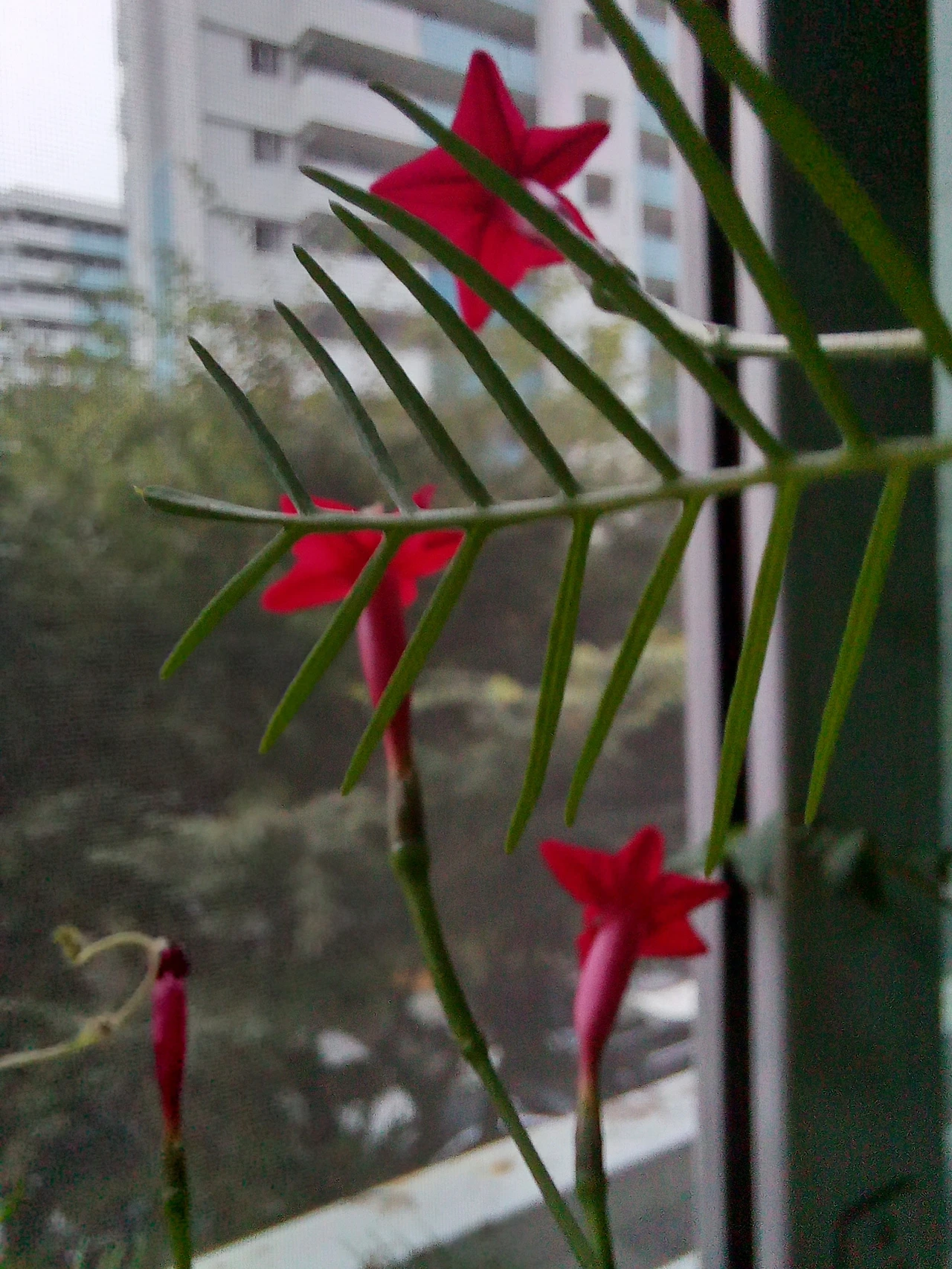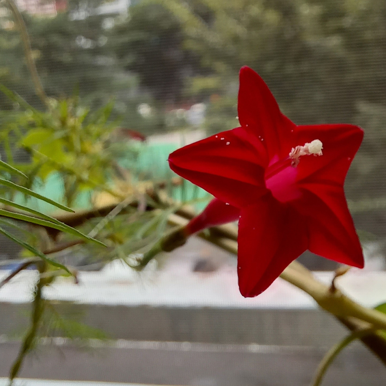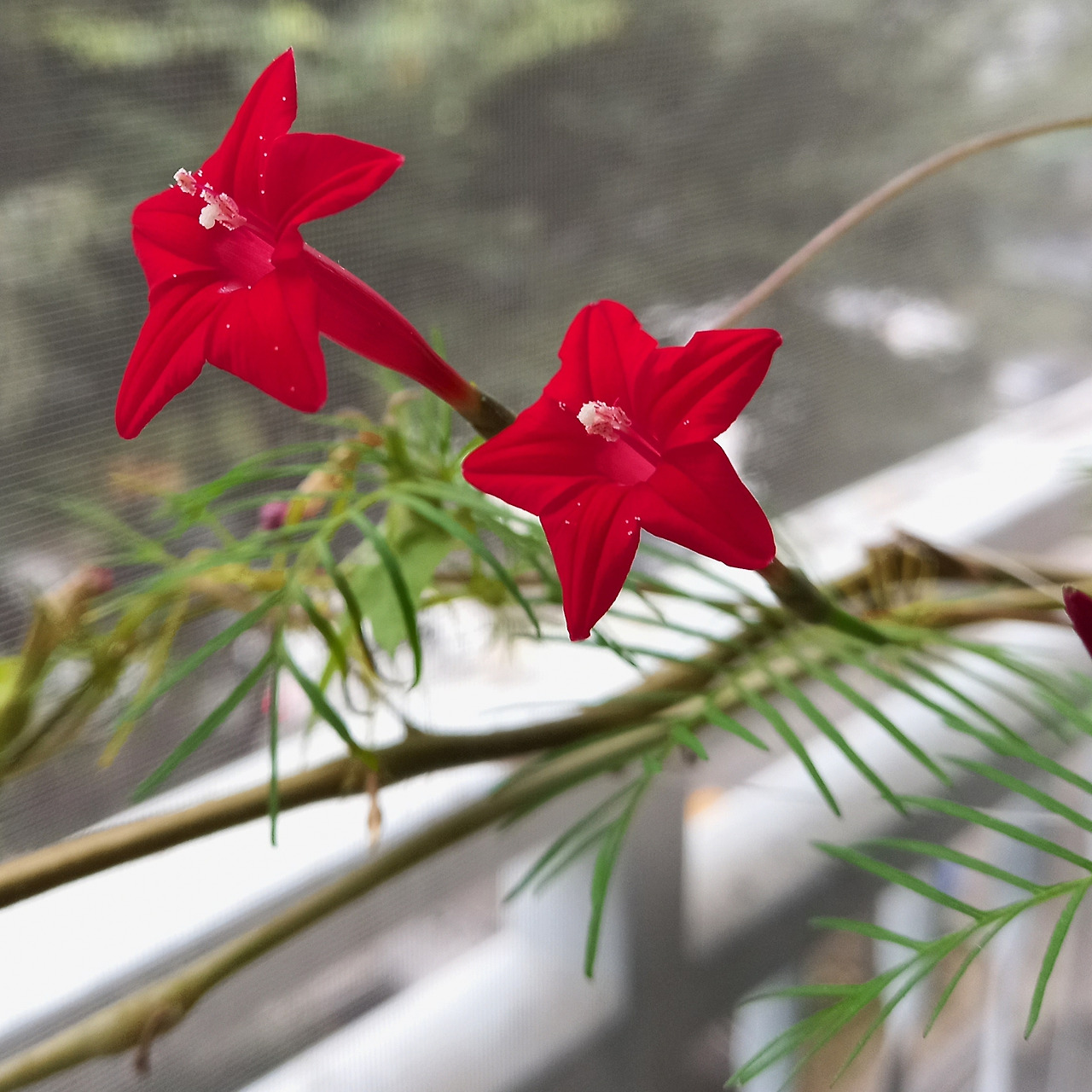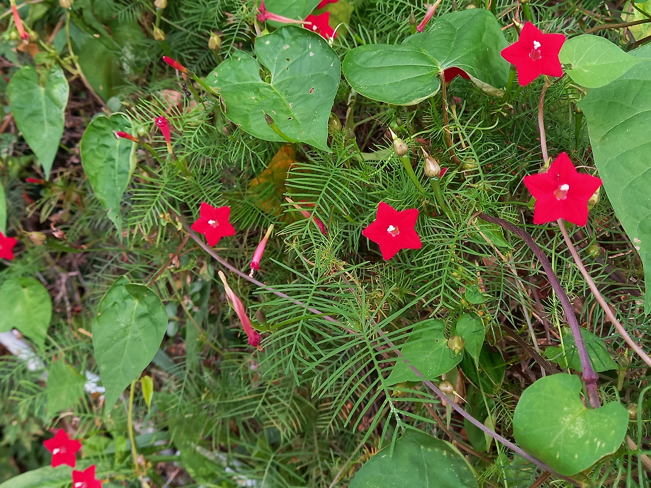 작은 나팔꽃잎은 갈라진 모습이 영락없는 작은 별이네요. 화려한 나팔꽃보다는 작지만, 진한 붉은 꽃은 그냥 지나칠 수 없답니다. 별처럼 생겨서 그럴까요? 꽃은 밤이 빛나는 별처럼 반나절이 지나면 시들해져서 아쉽습니다.