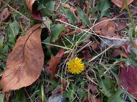 민들레가 동면하려고 납작 땅에 붙었는데 노란 꽃을 피웠다. 꽃은 더 추워지기전에 금세 지고 동그랗고 섬세한 홀씨 포자를 만들것이다.