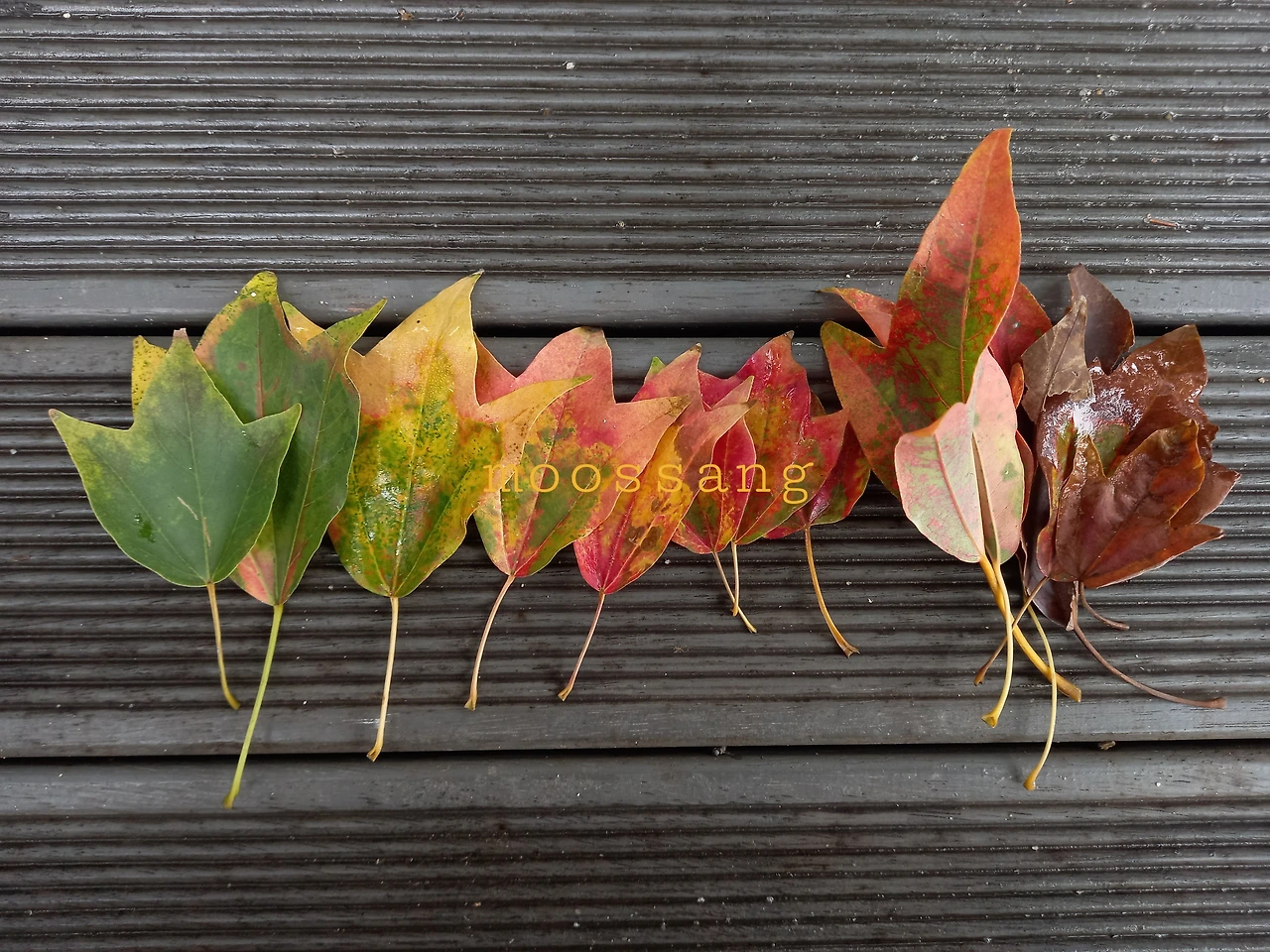 그리고 또 하나, 낙엽이 땅바닥을 꽉 채운 순간을 좋아한다. 낙엽을 치우기 전에 찍어야 하는데 놓칠 때가 많다. 그나마 예쁜 낙엽 찾기가 가장 부담이 없다. 하지만 떨어진 물건을 찾듯 꼼꼼하게 살펴야 한다. 꽃을 보느라 땅 위를 살피는 것이 익숙하지만, 꽃을 찾는 것보다 더 어렵기 때문이다. 바람이 순식간에 휙 데리고 가버리거나, 발에 밟혀 망가지기 전에 찾아야 한다. 청단풍나무 아래서 얼마 전 봤던 낙엽들이 보고 싶었는데, 다시 가보니 말끔히 청소가 되어 있었다.