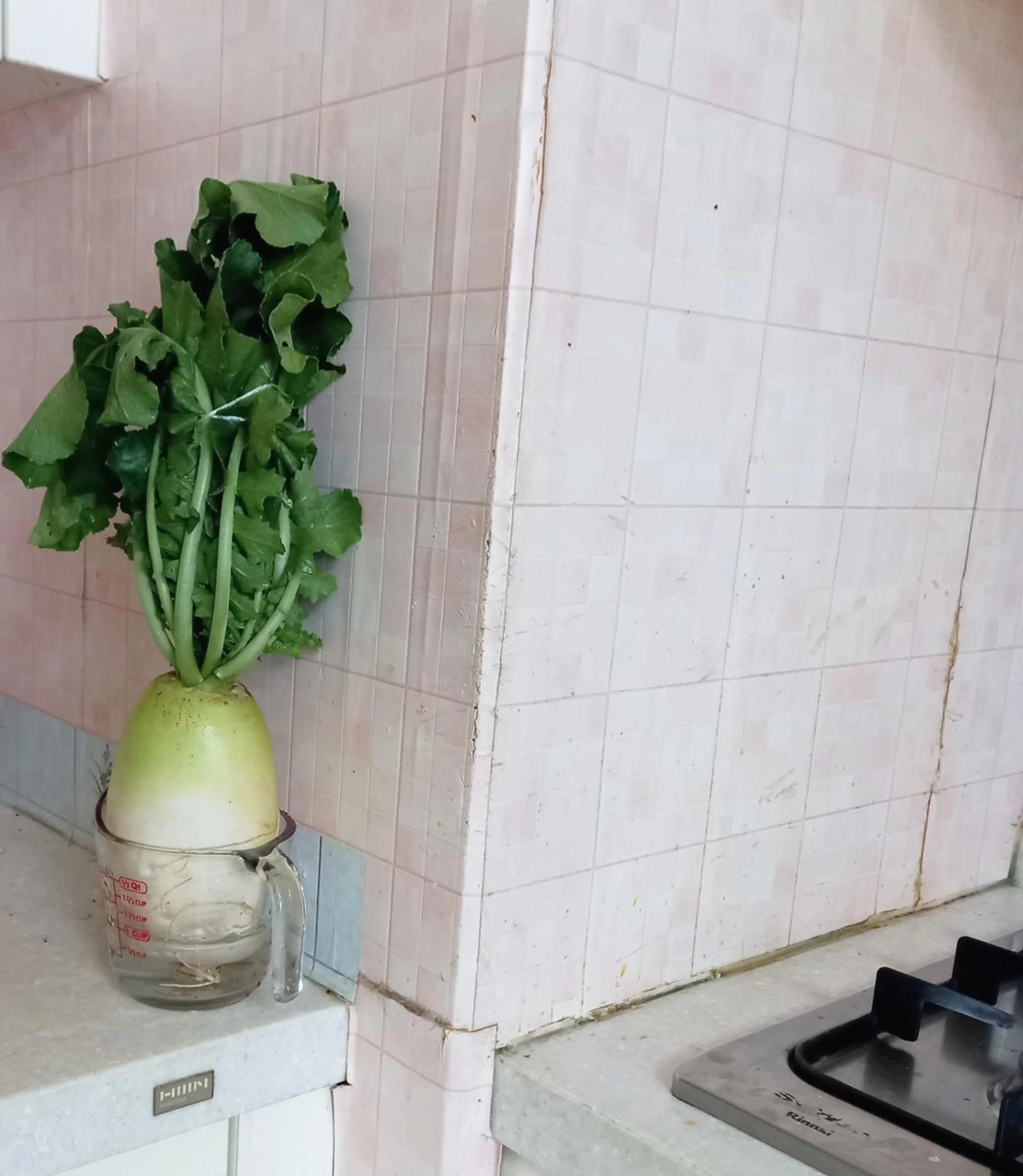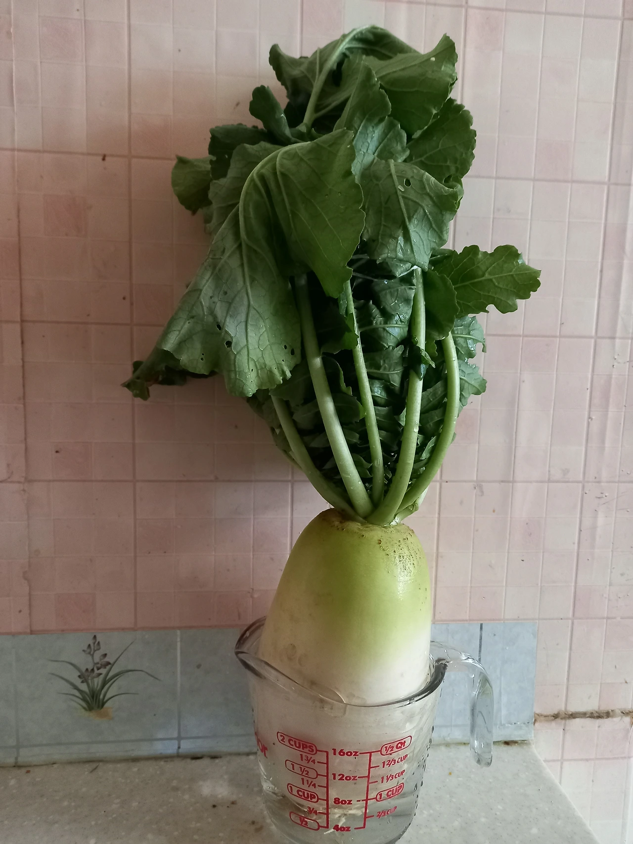 아래로 축 처지는 무청을 머리카락처럼 하나로 묶어 올렸다. 큰 계량컵에 넣으니 딱 맞았다. 결국 무를 먹기 아까운 마음이 이겨서 저녁 메뉴로 무생채는 만들지 못했다. 대신 텃밭에서 키운 무는 꽃병에 꽂은 꽃처럼 집안을 향기롭게 해주는 중이다.