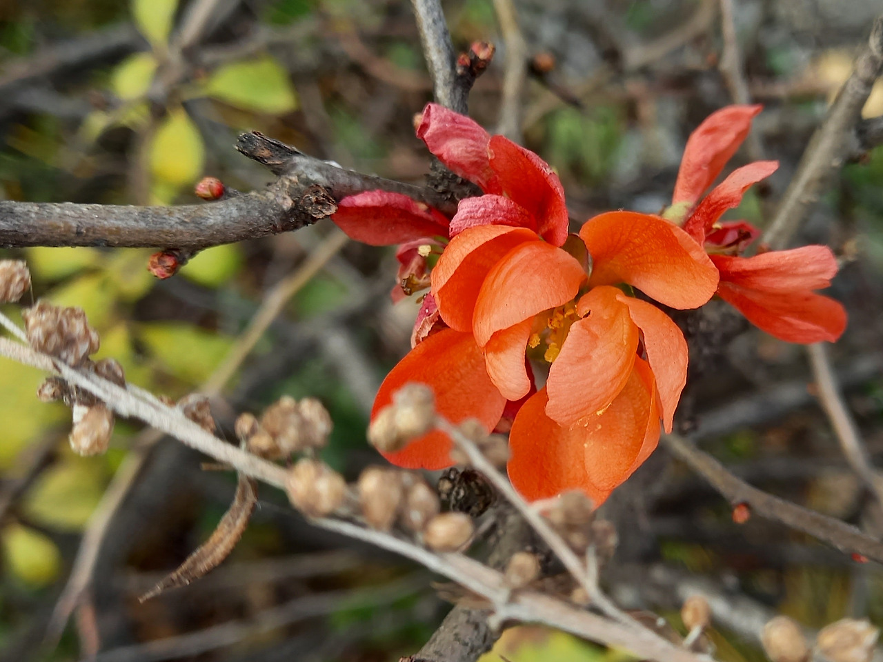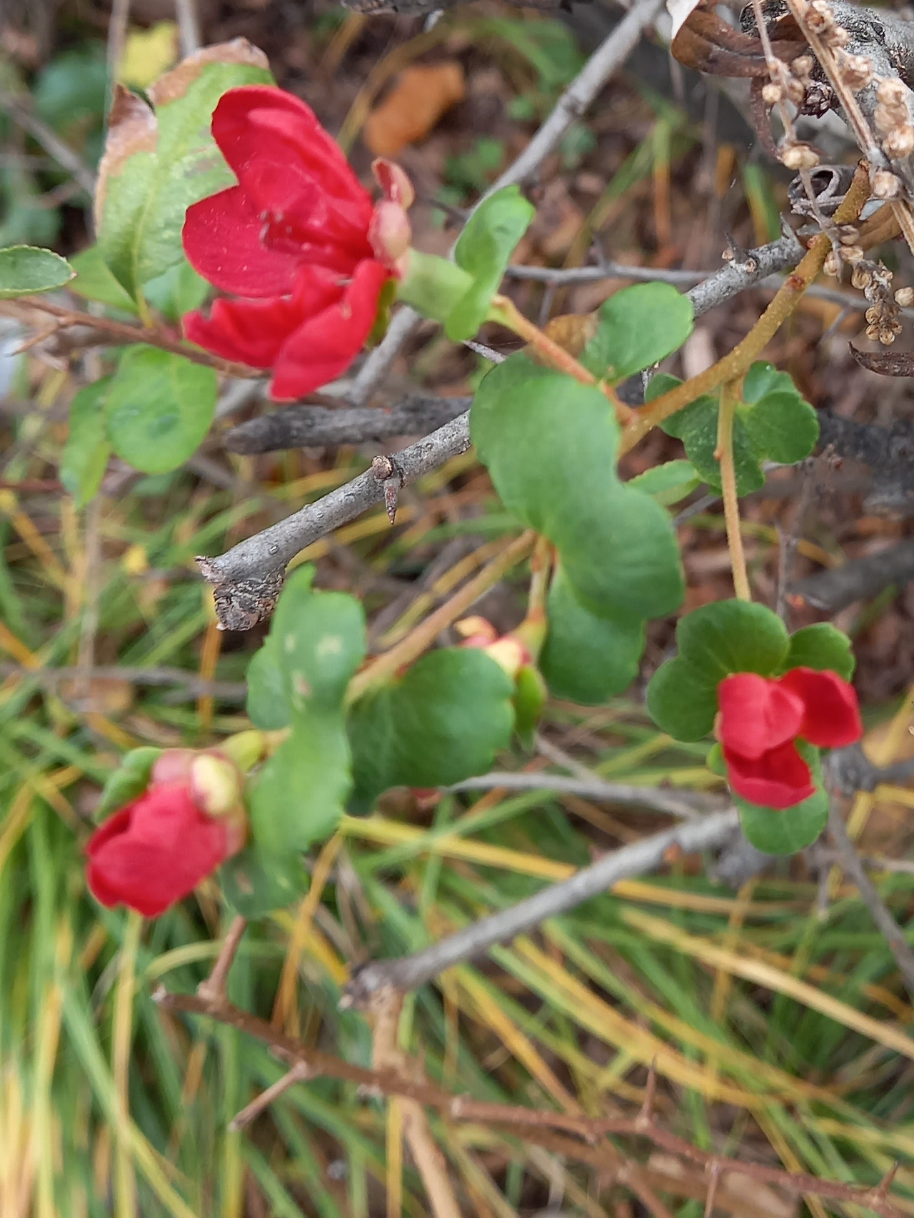 명자나무 열매와 꽃 (2021.11.3)@songyiflower인스타그램 화단에 명자나무는 할 일을 다하고 휴가를 보내는 줄 알았다. 그런데 잎이 떨어져 앙상해진 명자나무는 예상하지 못한 것을 보여주었다. 모과처럼 잘 익은 열매와 붉은 꽃이었다. 꽃잎은 겹겹이 꽃술을 감싼 채 찬 바람에도 꿈쩍하지 않았다. 명자나무는 붉게 칠한 손톱과 립스틱 바른 입술로 봄 보다 더 생기 있고 젊어 보였다. 날마다 나는 꽃이 떠났을까 봐, 조마조마하며 명자나무 앞으로 갔다.