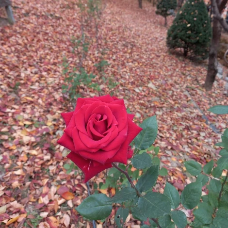 찬바람이 걱정이었지만 한낮은 태양이 너무도 보드랍다. 공원에 들어서지 기분이 한결 나아졌다. 사계장미들 볏짚으로 감싼 채 혹한을 견딜 준비를 하고 있었다. 공원을 벗어나 산책로에 빨간 장미꽃이 눈에 띄어서 사진을 찍었다. 낙엽이 깔린 위로 피어난 늦가을 장미가 봄에 보던 꽃잎과는 다른 매력이 있었다. 낙엽들이 카펫이 되어 소복하게 깔렸다.