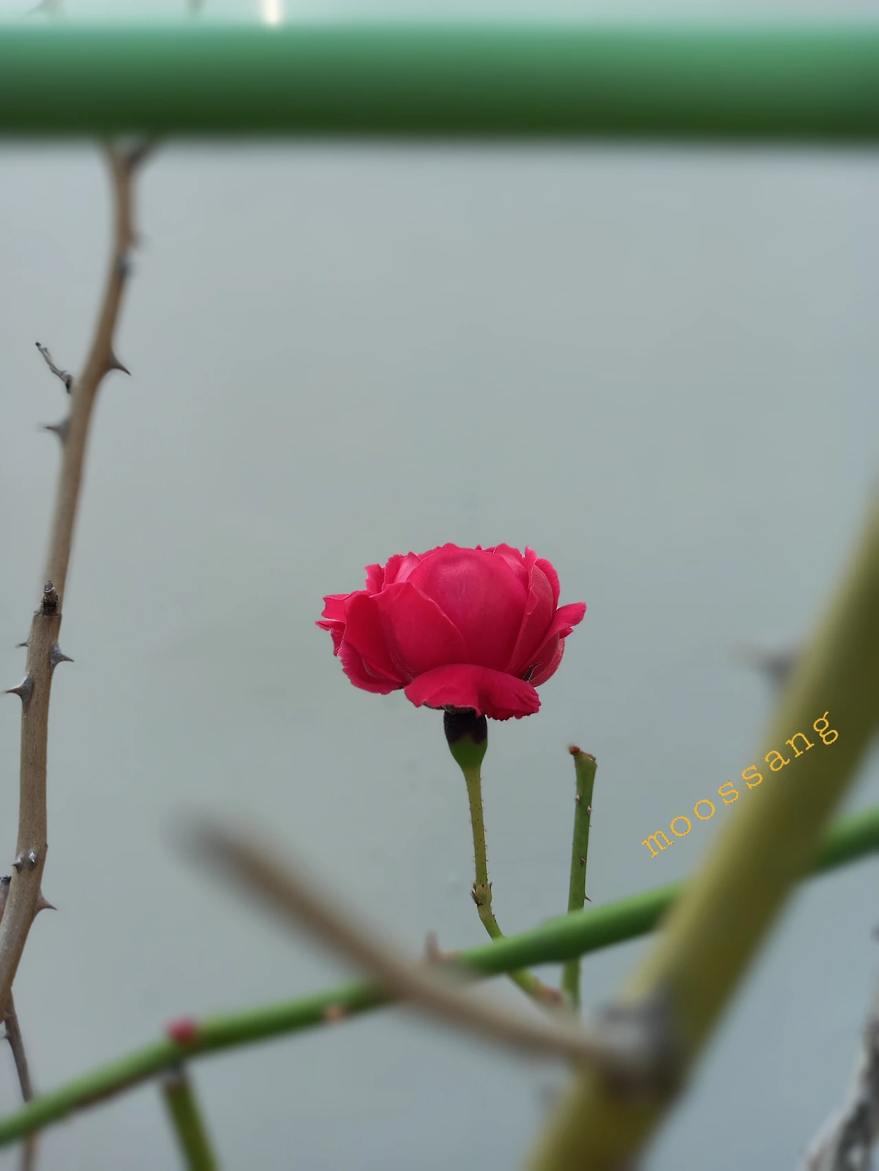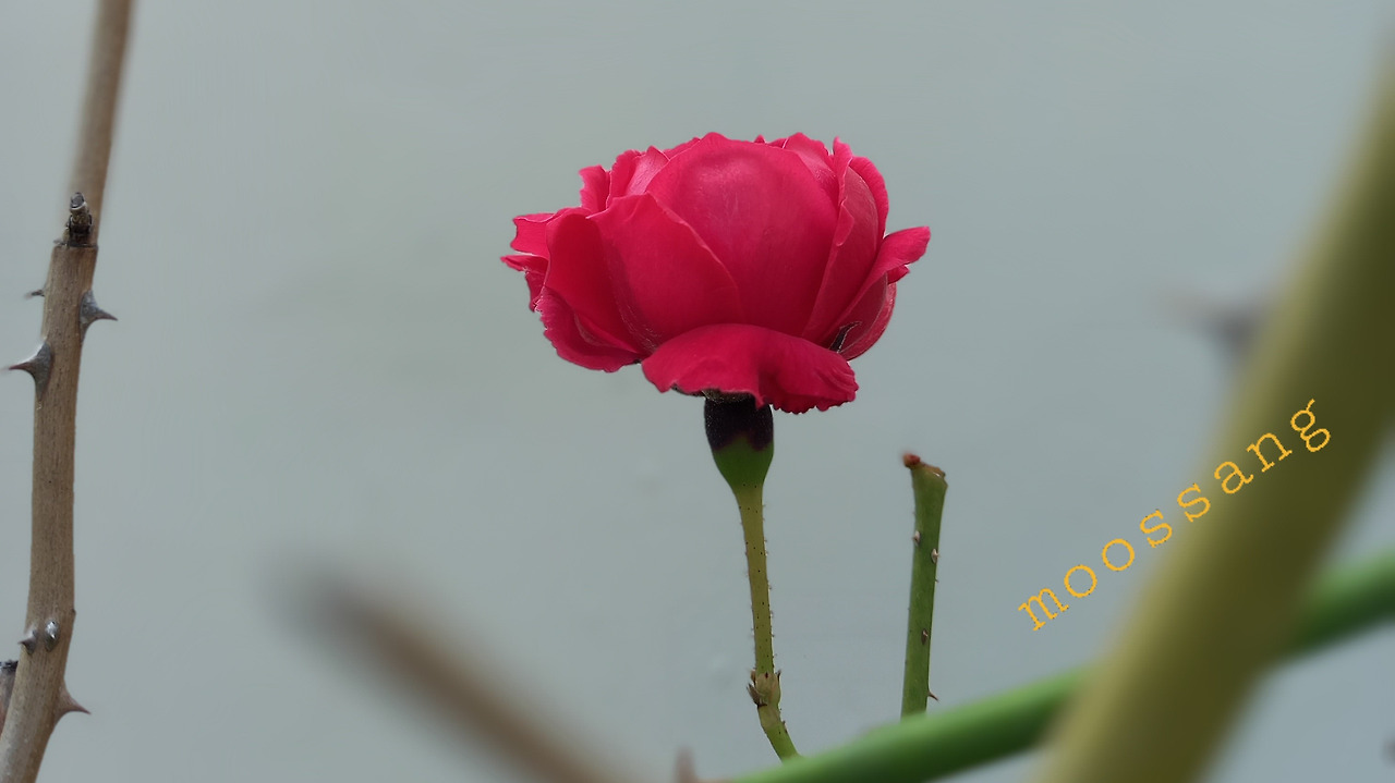장미덩굴이 화려하게 걸쳐졌던 담장엔 아무것도 남아 있지 않은 줄 알았다. 그런데 당당하게도 붉은 장미의 싱그러운 꽃잎은 내 앞에 피어 있었다. 찬바람은 냉정하게 글을 쓰라고 채근했지만, 나는 꽃을 보러 다니던 포근했던 날들이 그리웠나 보다. 겨울의 태양은 은근하게 빛을 내지만, 나는 땀이 날 정도의 뜨거운 온도가 필요했다. 초를 태우는 불꽃처럼 붉은 장미 한 송이가 내게 온기를 불어넣어 주는 듯했다. 장미 한 송이가 나를 둘러싸고 있는 소소한 행복의 순간을 기억나게 해 주었고, 냉정해진 마음에서 간신히 벗어난 듯했다.