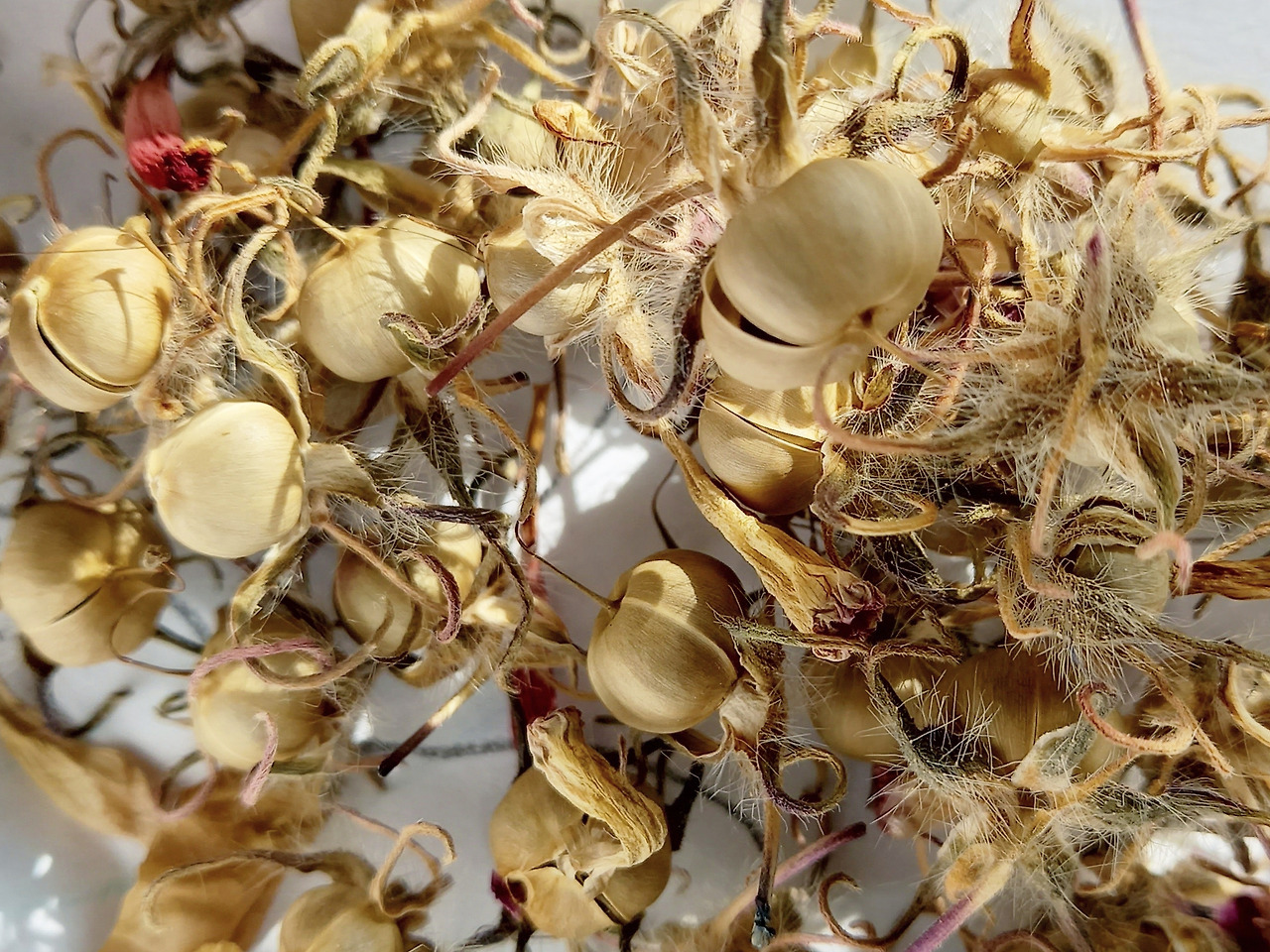 장미나무 가시보다 더 날카로워진 작은 가지들 사이로 나팔꽃 덩굴이 남긴 꼬투리가 보였다. 가느다란 갈색 줄기는 볏짚 단에서 나온 실오라기처럼 눈에 띄지 않았다. 그런데 열매를 단 나팔꽃 덩굴이라는 걸 알게 된 순간, 안경을 쓴 듯 세상이 환해졌다. 가지치기된 장미와는 다르게 나팔꽃 줄기는 아무렇지 않게 남아 있었다. 장미가 둘렀던 나팔꽃 덩굴엔 동그란 꼬투리가 대롱대롱 달려 있었다.