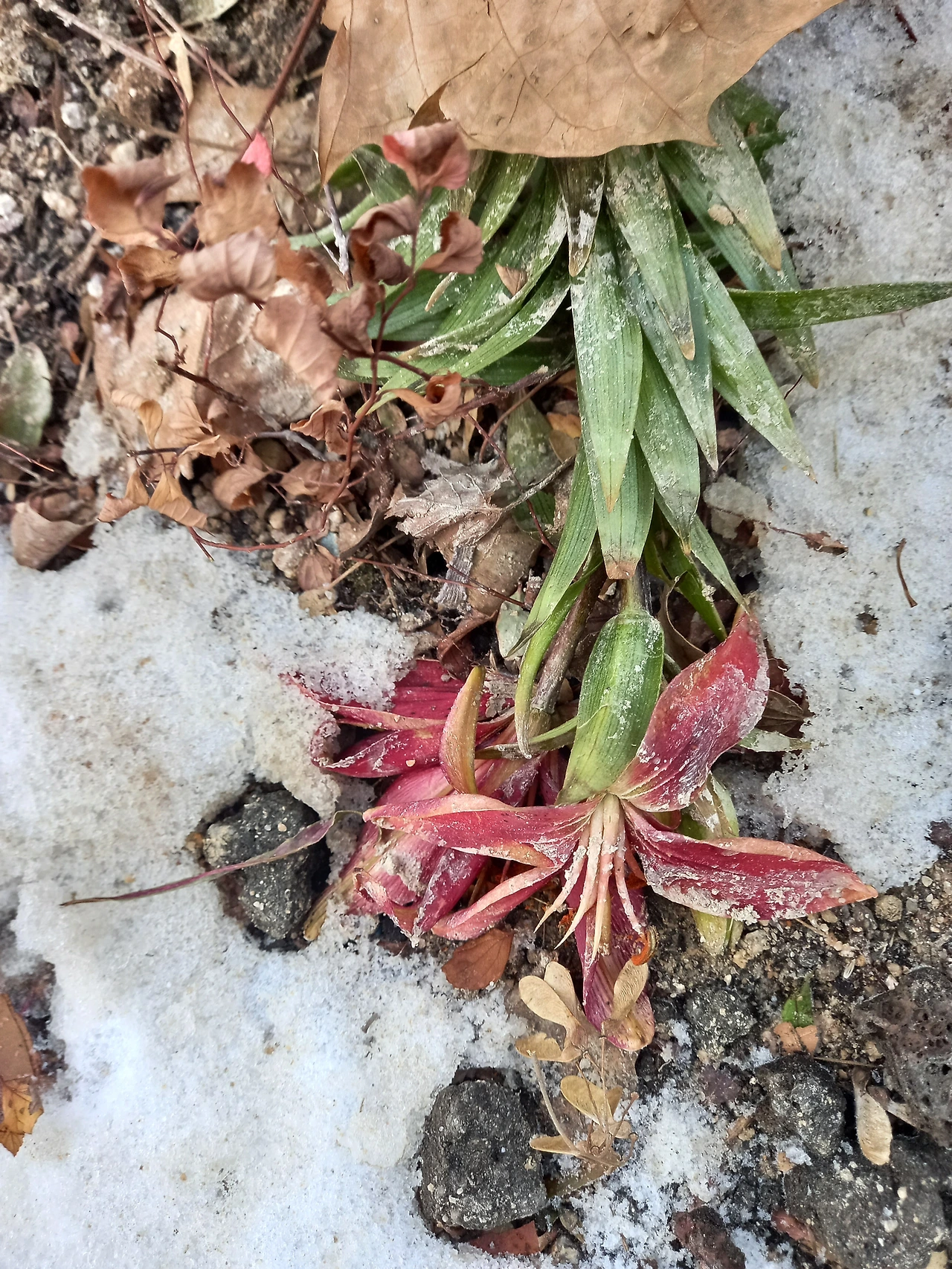 뿌연 안개에게 힘을 뺏긴 태양이 머뭇거리는 틈에 찬바람이 깊숙이 스며들어 온몸을 쭈뼛거리게 했다. 잠깐 동안 안개를 뚫고 나온 햇볕이 반가웠지만 흰구름 뒤로 숨어 버렸다. 어두워진 산책로 화단에 얼어붙은 나리꽃이 여전히 누워 있다. 겨울 공기는 꽃을 방부제처럼 며칠씩 그대로 유지시키고 있었다. 잠시 애도를 하듯 꽃을 내려다보며 지난날을 이해해보려 했다.