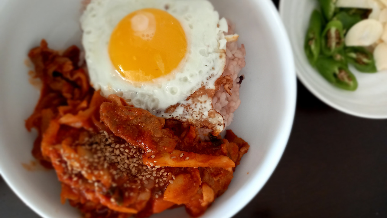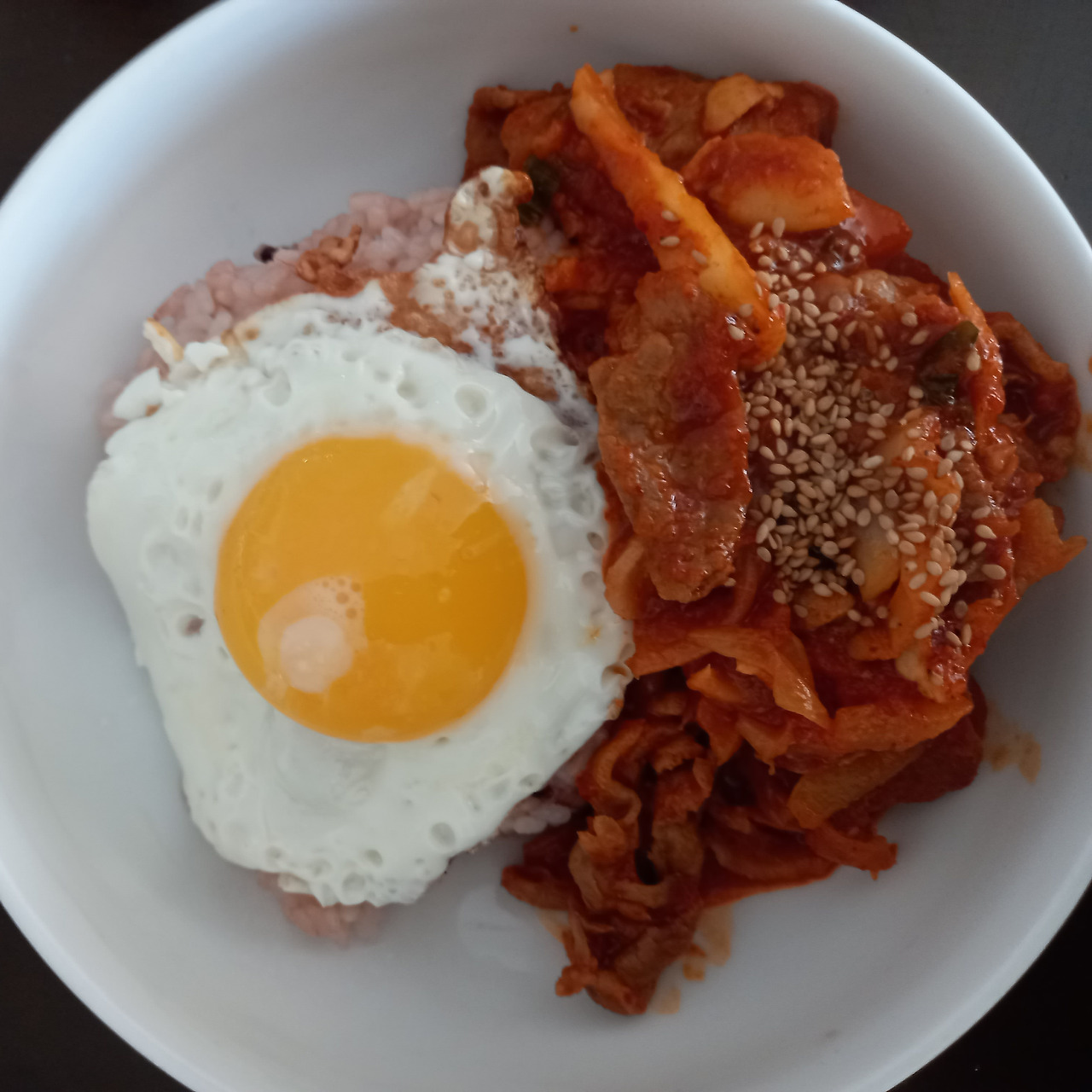 "제육덮밥 해줘. 계란 프라이 얹어서 말이야."
