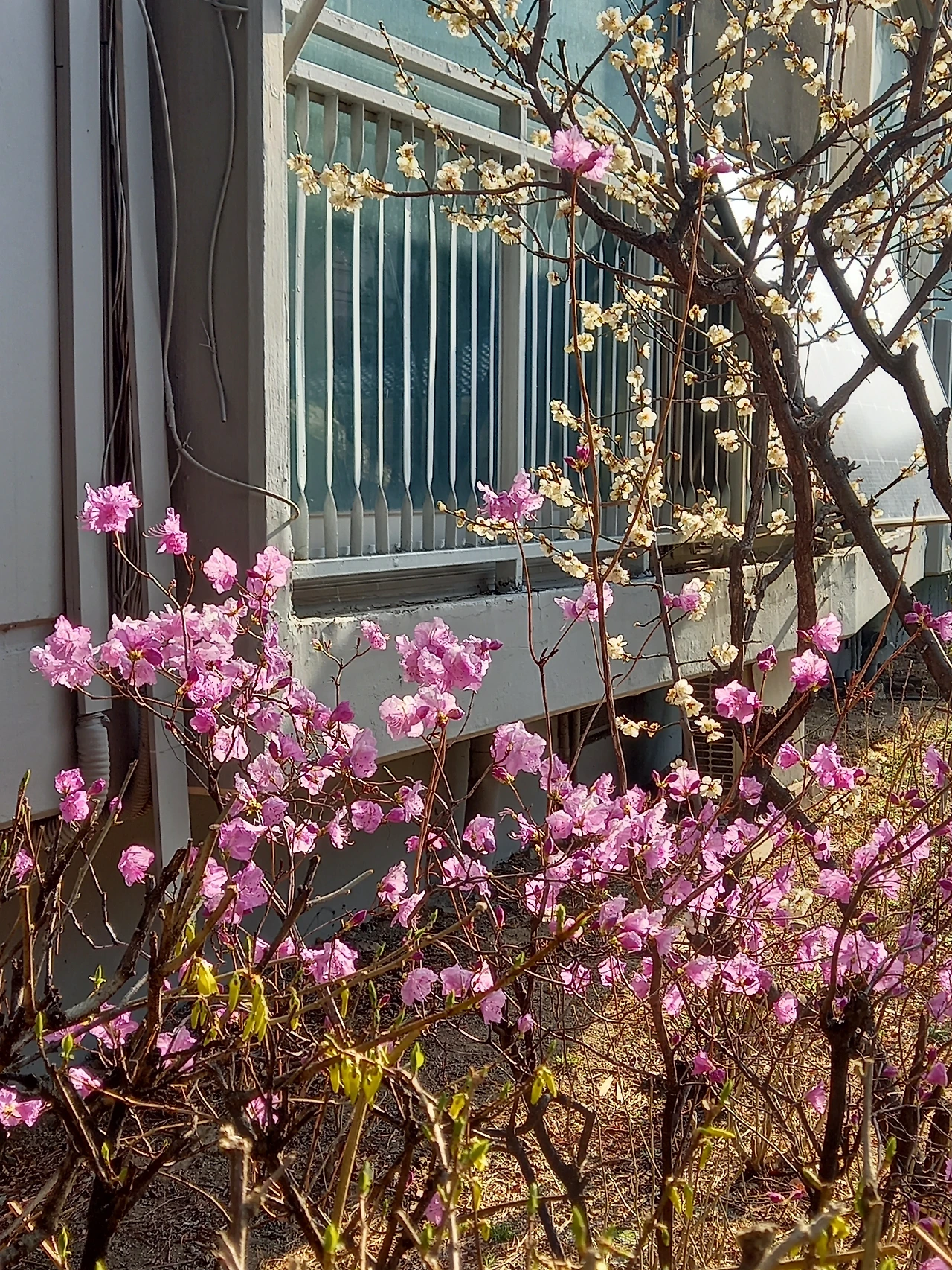 바닥에 올라온 꽃들을 보느라 바쁜데, 벌써 살구나무가 분홍 꽃봉오리를 내밀었다. 매화는 이미 지고 있고 백목련과 자목련이 막상막하 꽃을 피운다. 진달래는 이제 어디서든 눈에 띄고 개나리도 색을 맞추듯 점점 노랗게 가지를 채우고 있다.