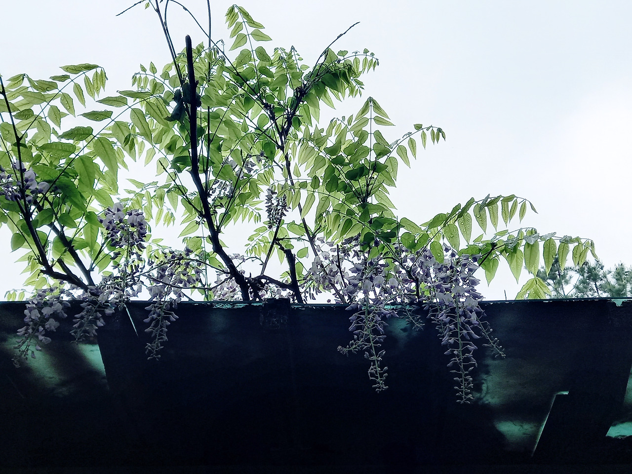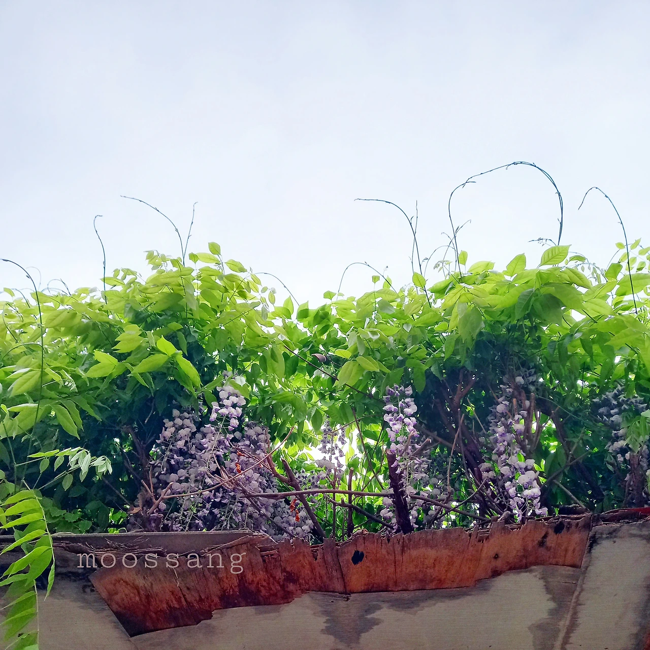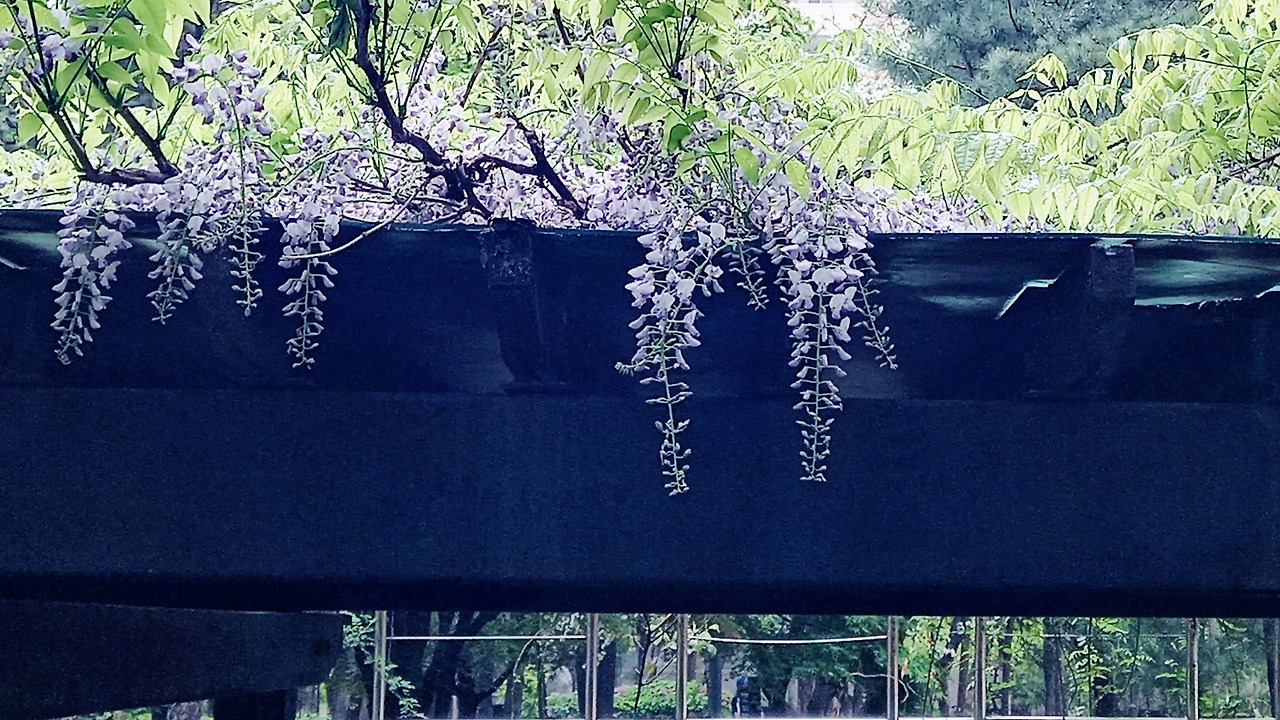 등나무 잎은 한들거리며 가지를 늘어뜨린다면, 꽃은 장식처럼 대롱대롱 매달려 핀다. 그렇지만 꽃을 찍으려면 사다리라도 있어야 할 듯 꽃나무는 찍기 어렵다. 등나무는 덩굴이라 지지대가 필요한데, 지붕 같은 가림막을 침대 삼아 꽃을 피운다. 발끝을 들고 올려다보니 나무가 누워 있는 가림막엔 꽃이 빽빽하게 뒤덮고 있었다. 향기를 계속 맡고 싶어 한동안 주변을 빙빙 돌았다