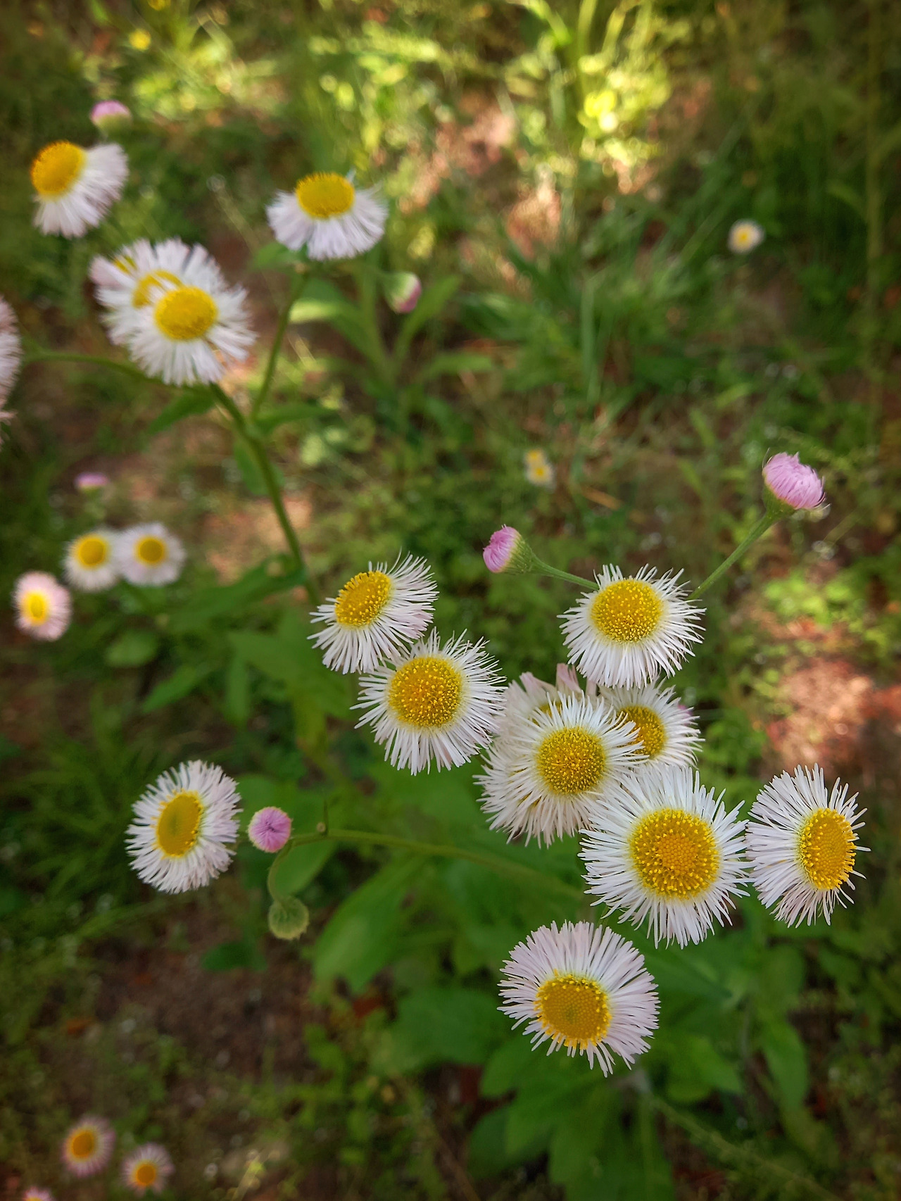 잠시 뒤 느티나무 뒤에 그림자가 검게 드리워진 곳에 만발한 봄망초 꽃밭을 발견하고는 할 말을 잃었다. 나무 아래는 늘 응달진 곳인데 봄망초는 만발했다. 화단 안쪽이라 가까이 들어가 볼 수 없었지만, 지난봄에 만난 봄망초 꽃밭과 똑같았다.