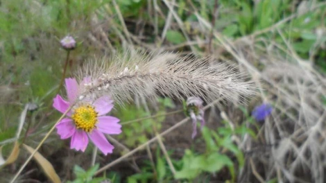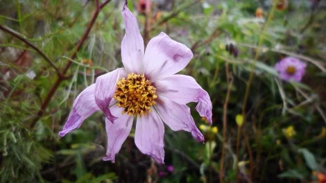 특히나 야생초 덤불에서 반가운 꽃은 코스모스다. 이 코스모스는 땅 아래에서 얼마나 기다리다가 피어났을까? 추워진 날씨에 코스모스가 화석처럼 굳은 모습이다. 꽁꽁 얼었지만 아직 분홍색 꽃잎은 생생하다.
