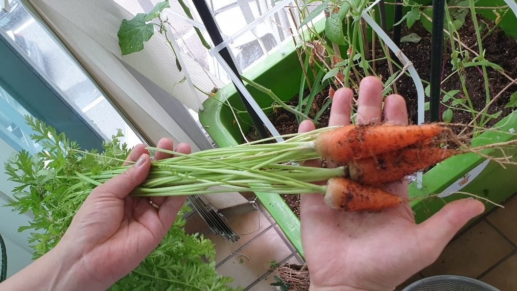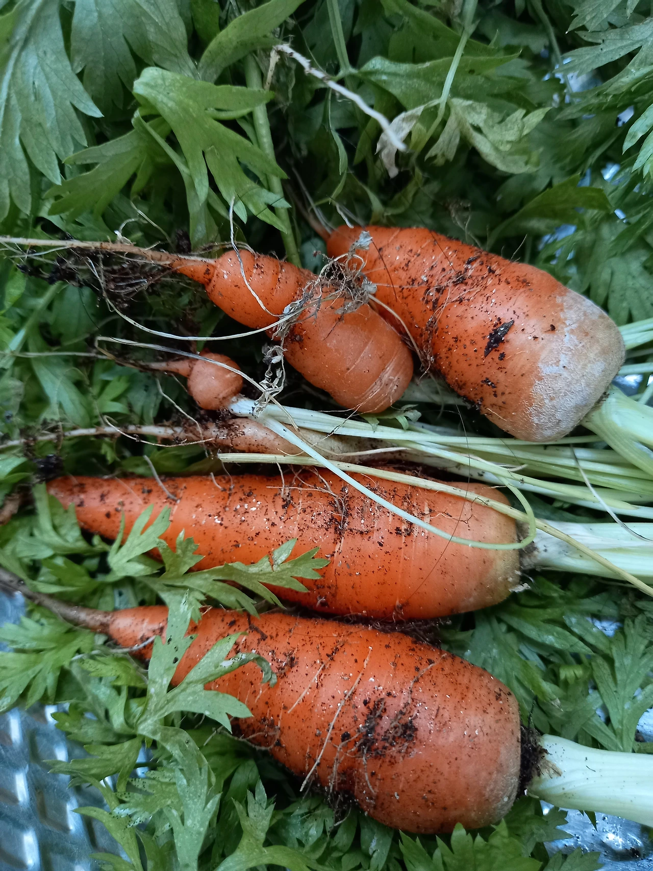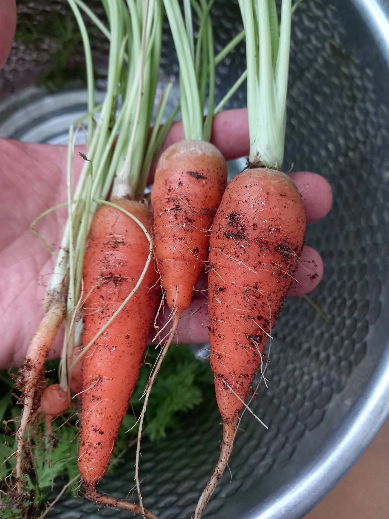 지난번 텃밭에선 당근 키우기가 쉽지 않다는 걸 배웠다. 제대로 자란 당근은 달랑 하나가 수확이 전부였다. 이번 수확물은 그에 비하면 개수가 더 많았다. 당근 크기는 텃밭에서 자란 것과 비교할 수 없을 만큼 작지만, 모양도 그럴듯해서 피터 레빗이 들고 있는 당근처럼 귀여웠다.