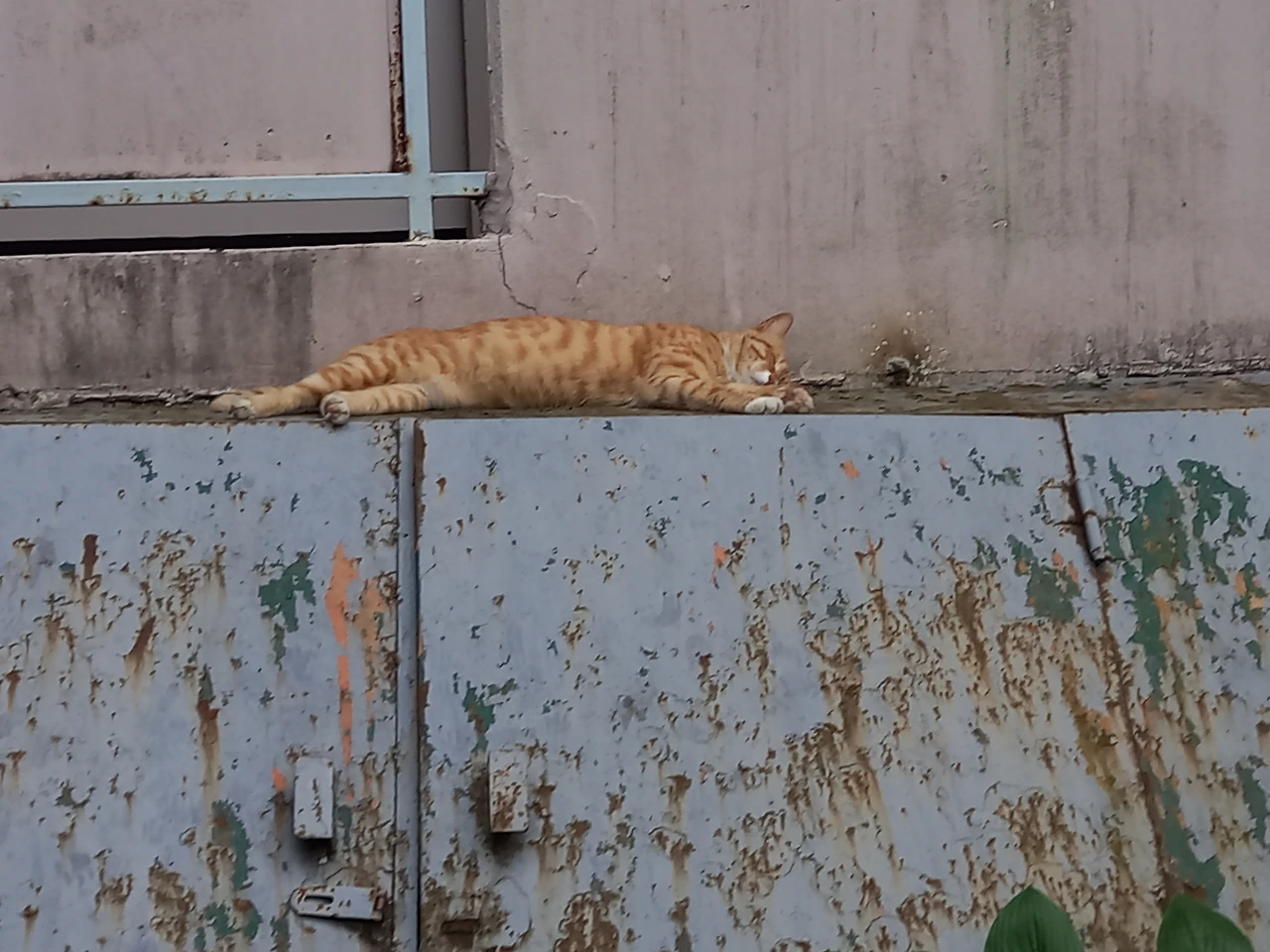 낡고 허름한 난간에 아주 편안한 표정으로 뒷다리를 길게 뻗고 꼬리까지도 툭 던져둔 채 잠을자고 있었다. 웅크린 채 자는 길고양이들은 보았지만 길게 쭉 뻗은 다리로 자는 모습은 낯설었다. 참나리꽃을 찍어야 하는데 고양이가 깰까 신경이 쓰여선지 꽃보다 고양이를 먼저 찍었다. 사진을 찍는 둥 마는 둥 하고 고양이를 바라보았다.
