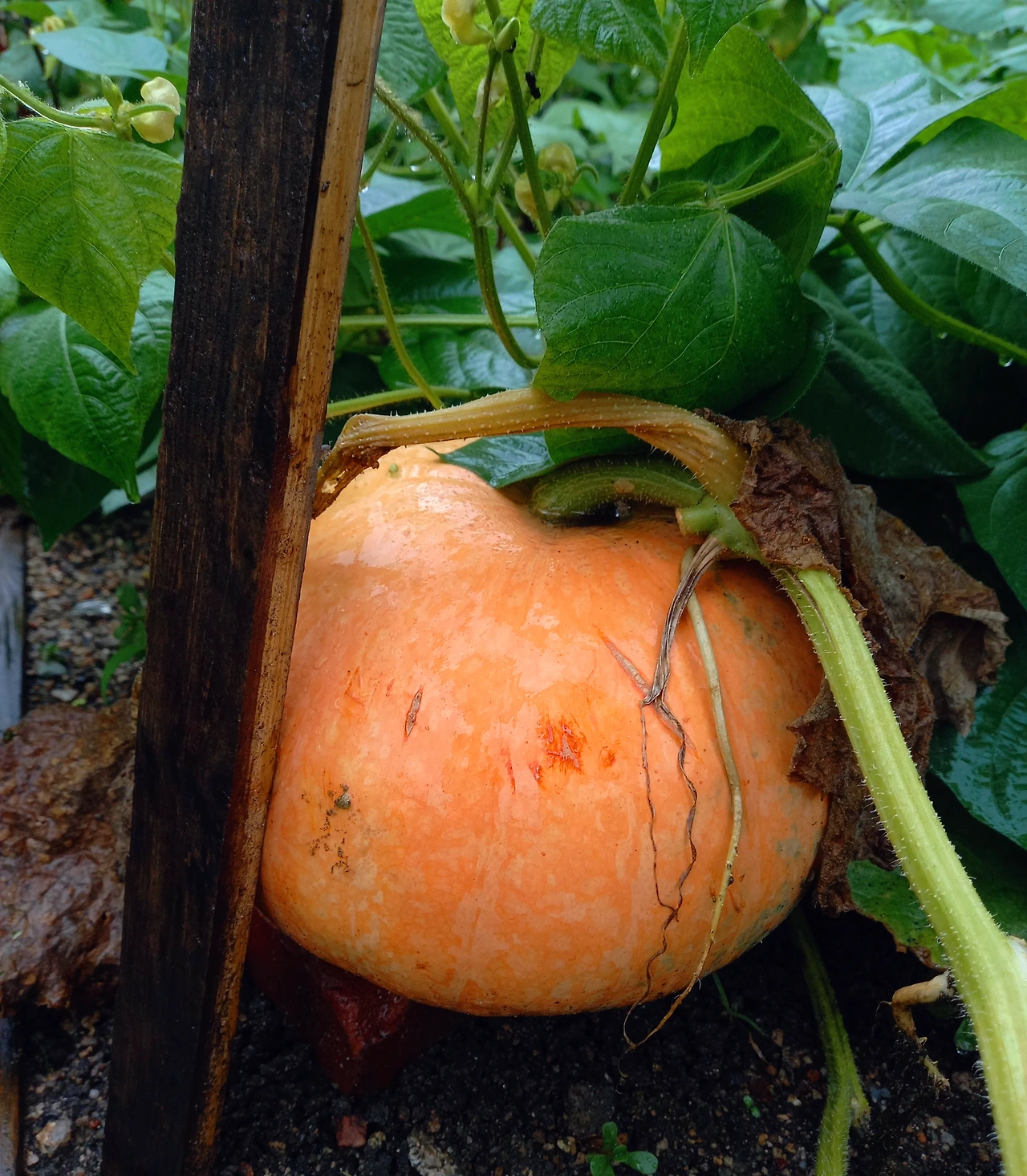 다들 주어진대로 여전히 할 일을 하고 있었다. 나만 멈춘 듯 더디게 살아가나 싶었는데, 텃밭을 둘러보고 나니 모든 것이 그대로였다. 마스크도 내리지 않았는데, 깨끗한 공기를 마신 듯 몸이 충전된 듯 가뿐했다. 작년에는 보이지 않았던 황금빛 늙은 호박 넝쿨이 눈에 들어왔다. 밭의 절반은 비었지만 고추는 주렁주렁 달렸고, 호박 줄기는 단단한 나무처럼 굵고 힘이 넘쳐 보였다. 호박은 주인이 둘러놓은 나무 조각이 작은 집처럼 아늑하고 벽돌을 받쳐주어 호박 아래는 물이 고일 틈이 없었다. 대단한 일이 벌어지고 있었다. 얼핏 봐도 호박은 잘 익은 수박만큼 크기가 자랐다. 늦가을이 되면 주름이 잡히고 더 커져서 주인의 얼굴에도 미소와 함께 주름살이 잡힐 것이다. 상상만으로도 호박이 보여줄 결실은 정말 긍정적이었다. 여름 텃밭엔 호박들이 힘찬 전성기를 보내고 있었다. 가을 풍성함을 그대로 담은 호박이 영그는 과정은 여름 없이 불가능하다는 걸 잊고 있었다.