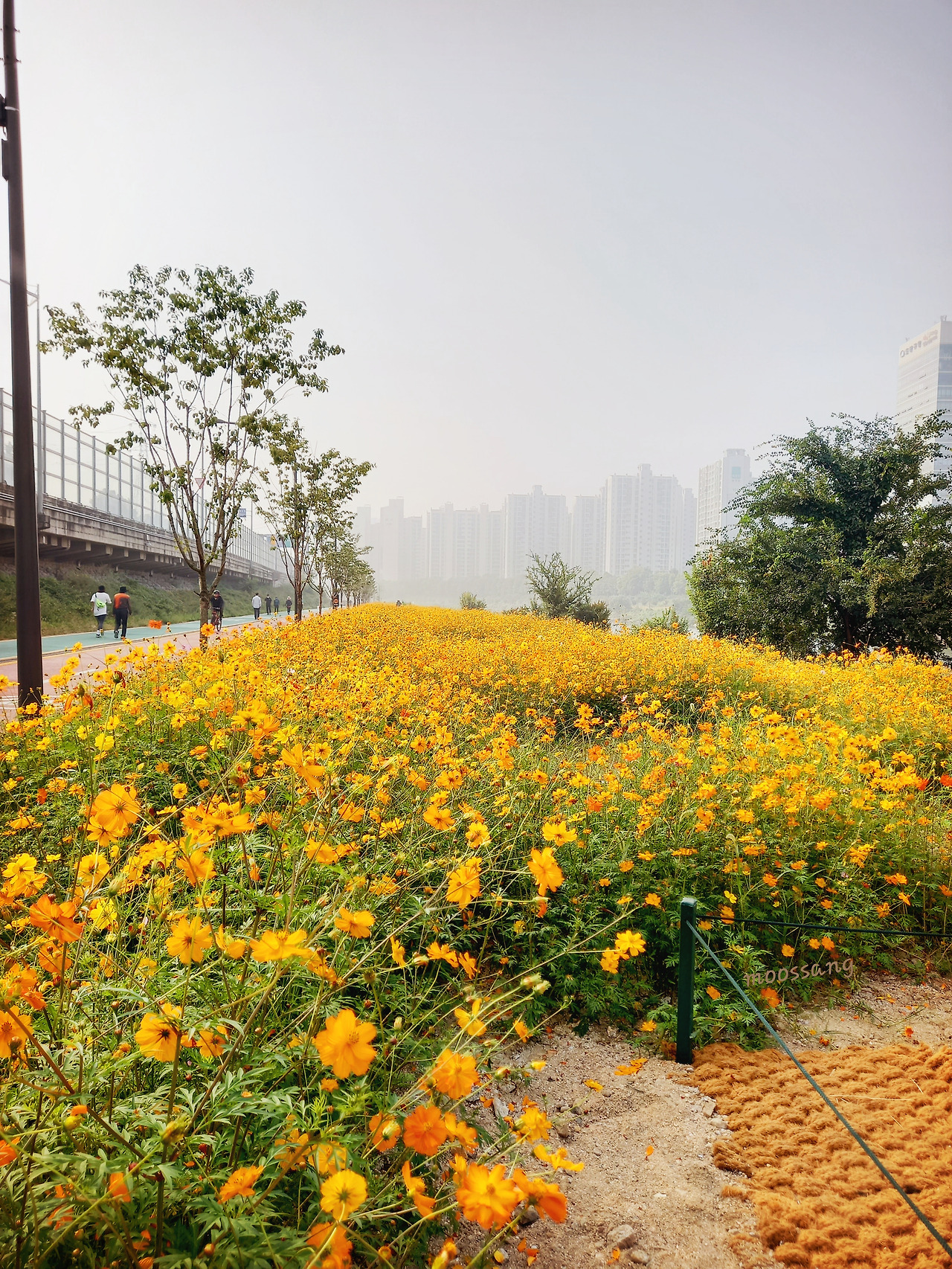 꽃을 따라 계속 걸었다. 촘촘하게 노란색과 주황색을 오가며 일렁이는 코스모스는어딘지 모르게 8월의 태양을 떠올리게 했다. 바닥을 빼곡하게 채운 꽃잎들은 강바람에 서늘해진 몸을 감싸며 미지근한 온기를 느끼게 했다.