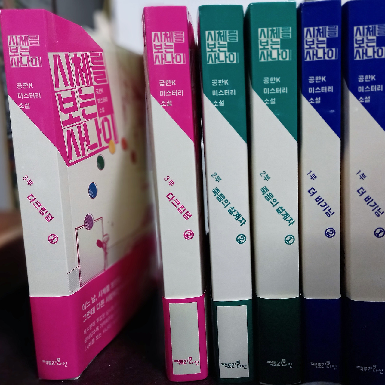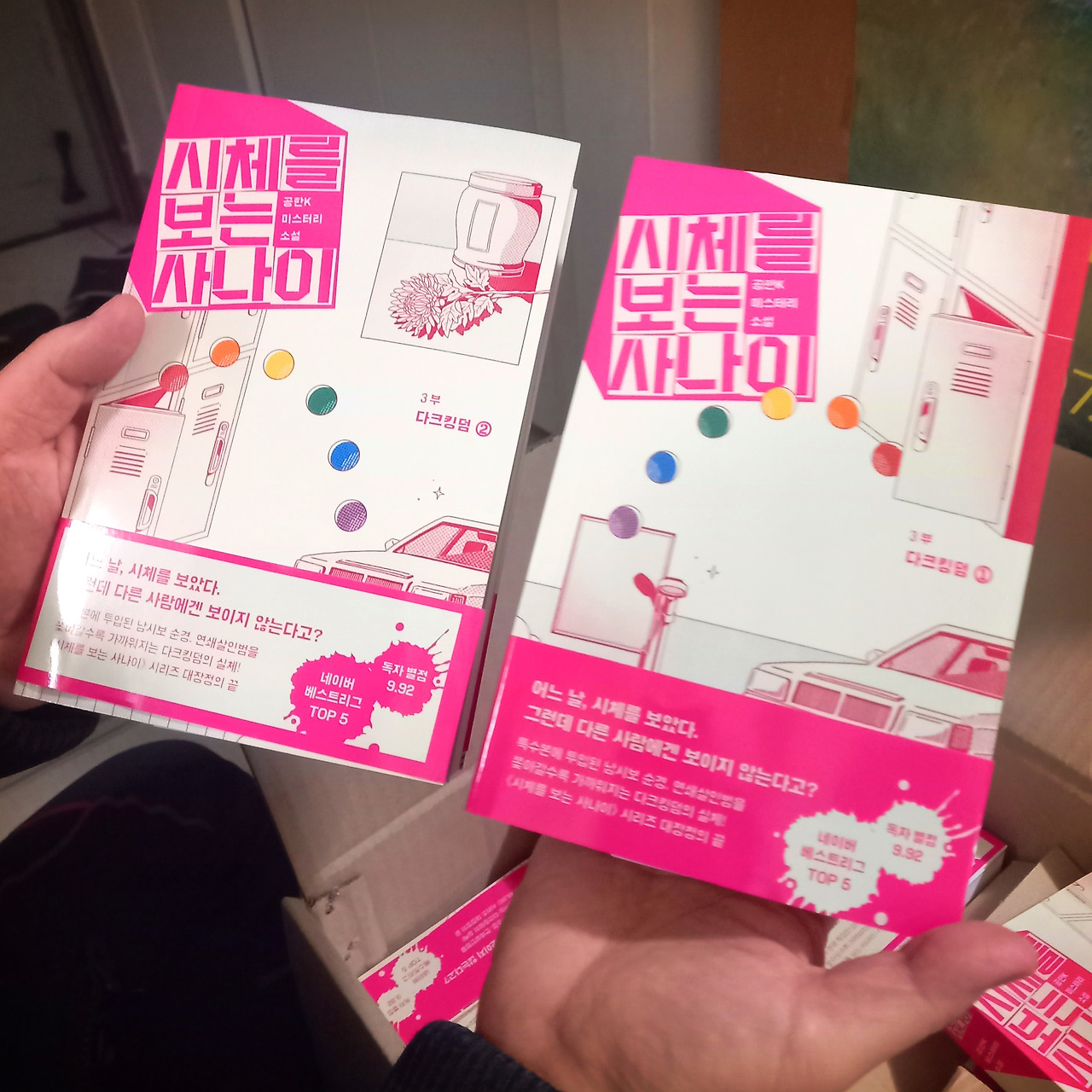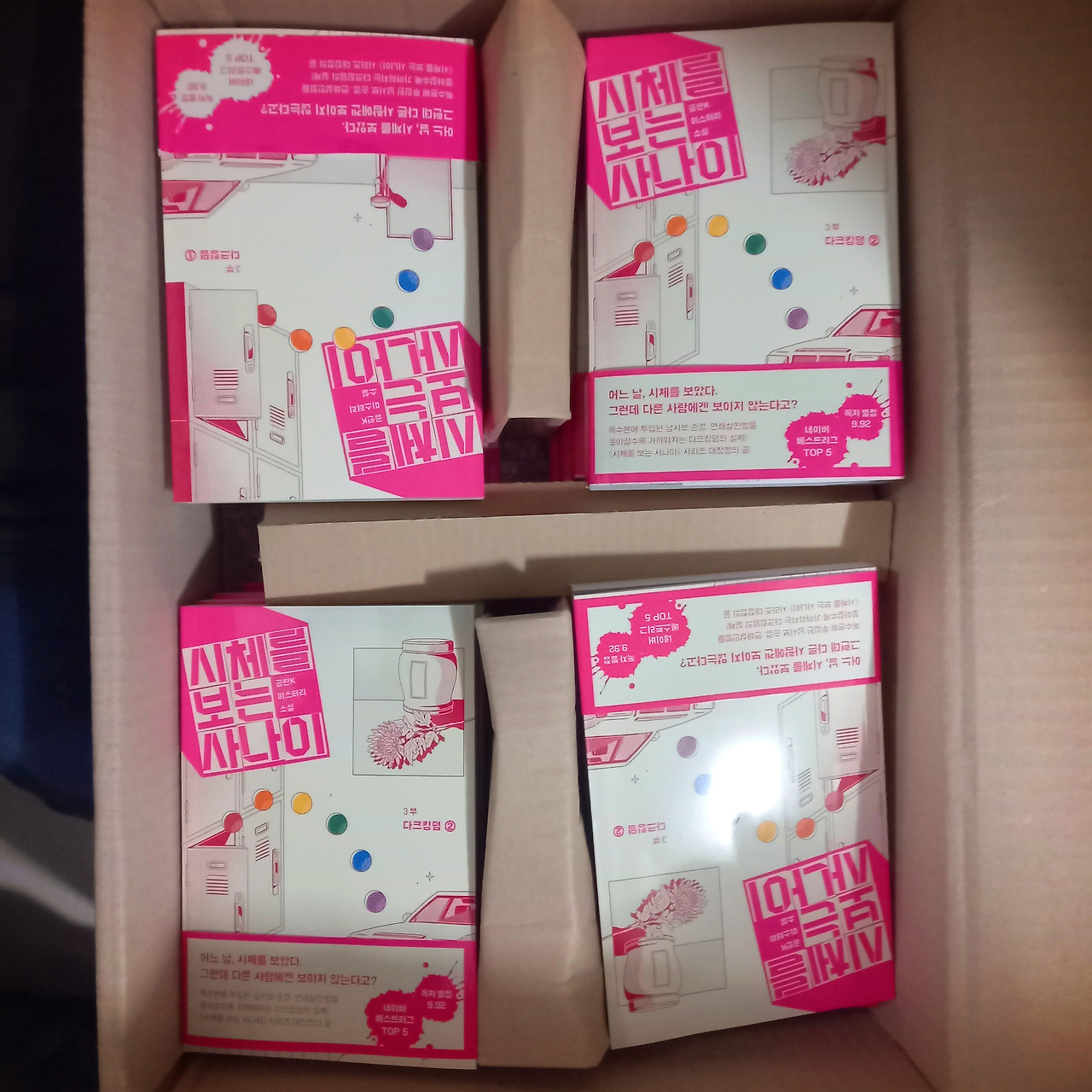 인쇄소에서 나온 책이 모자라 두 번에 나눠서 출판사에서 보낸 마지막 저자 증정도서였다. 앞서 출간된 1부는 봄에 여름엔 2부 그리고 2022년을 3일 남겨둔 겨울에 3부가 나왔다. 마지막 책이 담긴 택배 상자엔 오래 기다린 만큼 페이지 수도 천 페이지가 넘는 <시체를 보는 사나이- 3부 >가 들어 있었다.