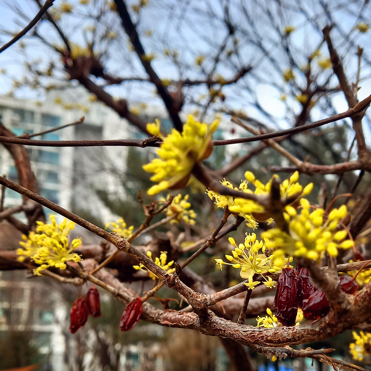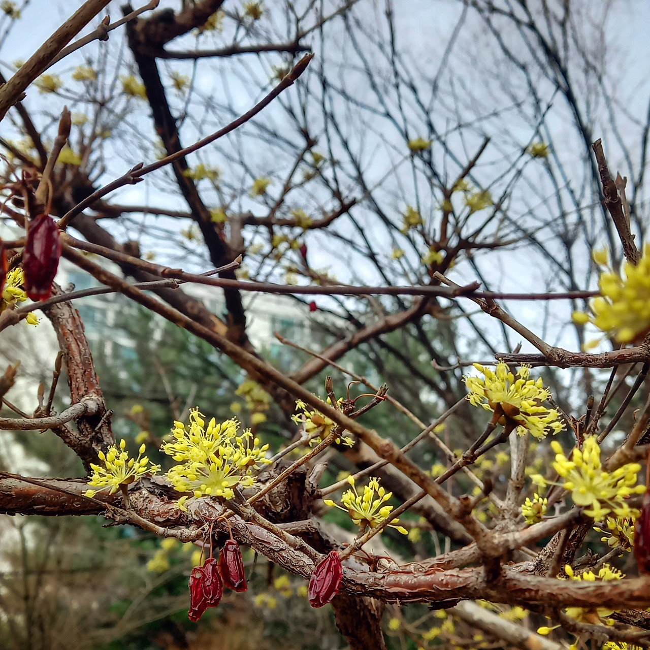 참 이상했다. 산수유나무가 빙 둘러 심어진 공원이었다. 작년에 보았던 노란 꽃을 기대하고 갔는데, 나무들은 진한 빨간색 산수유가 대롱대롱 달려 있었다.